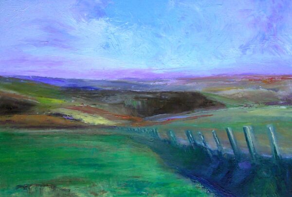 This work, in oils, shows a moorland landscape around the Brendon Two Gates area. It was sketched en plein air, and then painted in the studio.