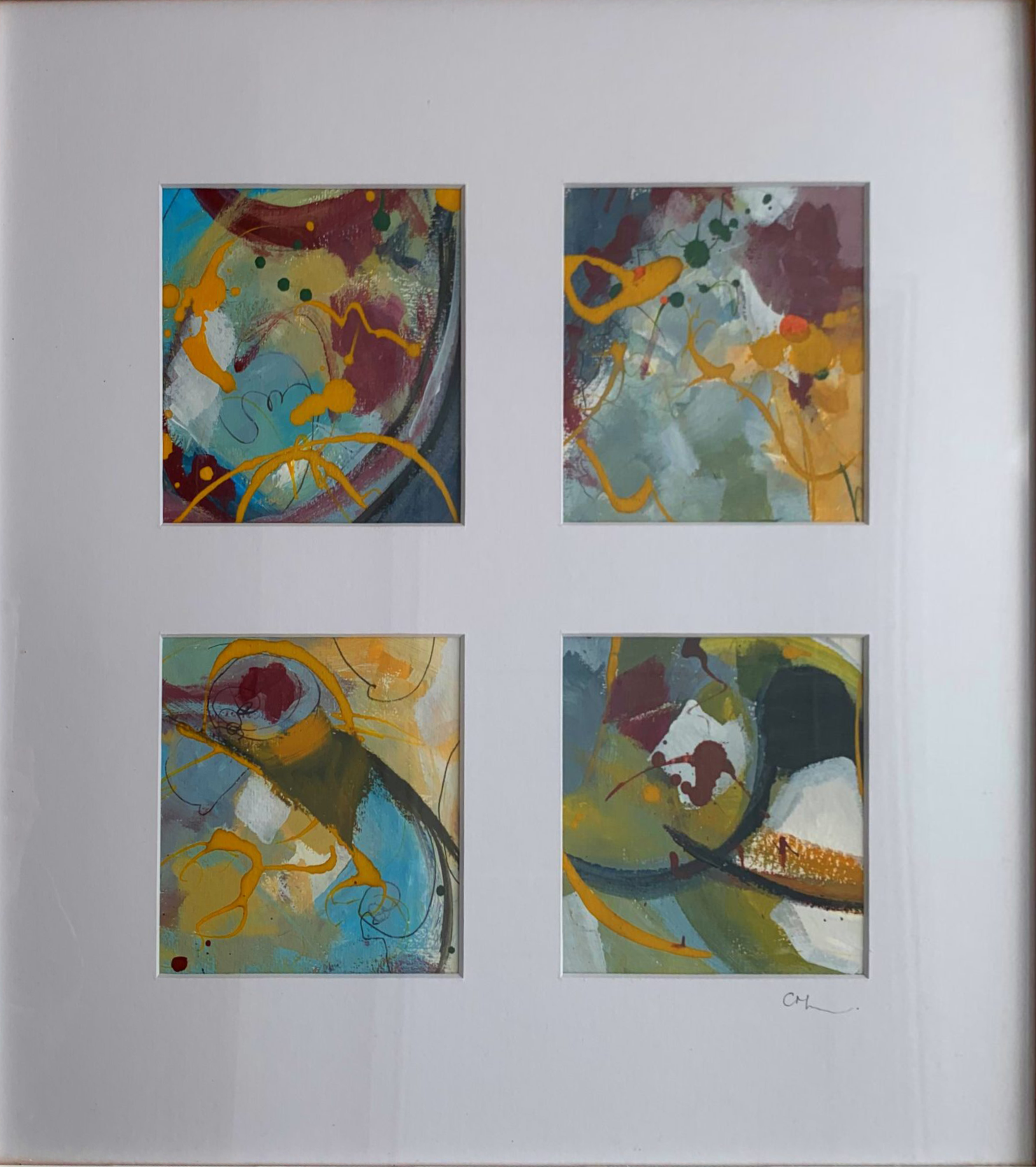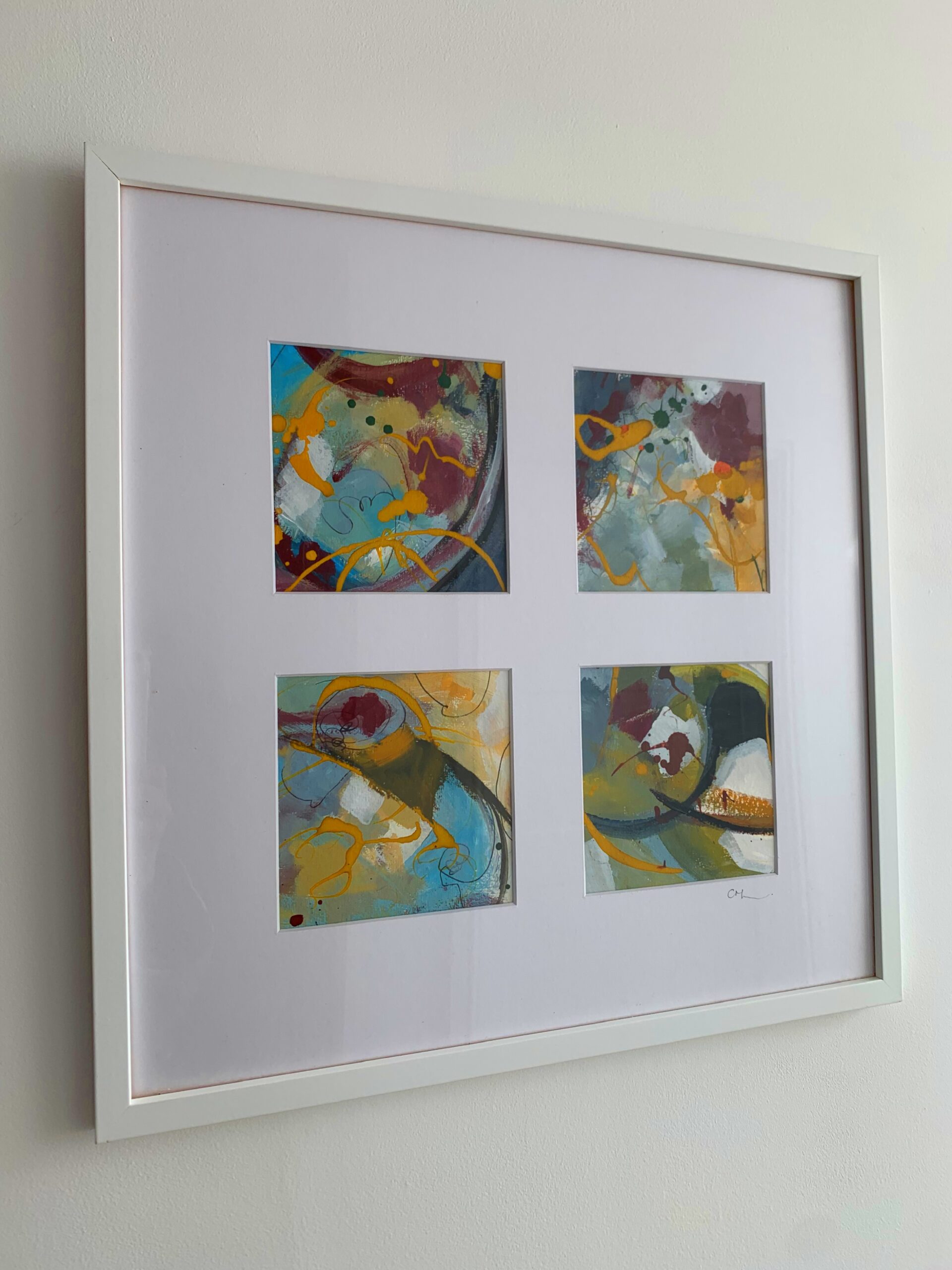 Mixed media - Watercolour, acrylic and ink work on paper and framed in 4 sections. Energetic abstraction enjoying colour in a limited palette