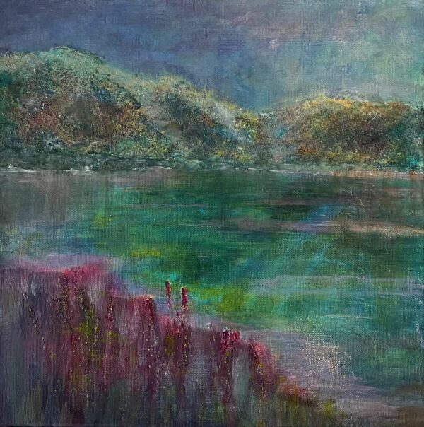 Escape to a tranquil oasis with this beautiful artwork of a mountain lake at dawn. Its vibrant blues and greens, along with its captivating purple flowers, come alive with a unique, textured finish. Allow yourself to be taken away and to be inspired! The artwork measures 12" x 12" x 1.5" (30cm x 30cm x 3cm) and comes complete in a floating black frame which really makes the colours pop. It is ready to hang the minute you take delivery and shipping is free!