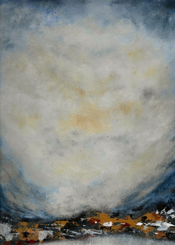 Immerse yourself in the enchanting world of "Mystic Ochre," a captivating painting that transports you to a realm of mystery and awe. This artwork unveils a breathtaking sky, painted with a mesmerizing palette of blues, Paynes Grey, and white, while majestic mountains rise with shades of sienna, ochre, and white. The sky commands attention with its ethereal presence. Layers of blues, ranging from the serene light blue to the deep azure, create a sense of vastness and depth. The play of light and shadow dances across the canvas, as wisps of clouds drift amidst the celestial expanse. Hints of Paynes Grey add an enigmatic touch, evoking a sense of intrigue and wonder. This acrylic painting on paper is mounted on sturdy 9mm board and set in a floating frame ready to hang.
