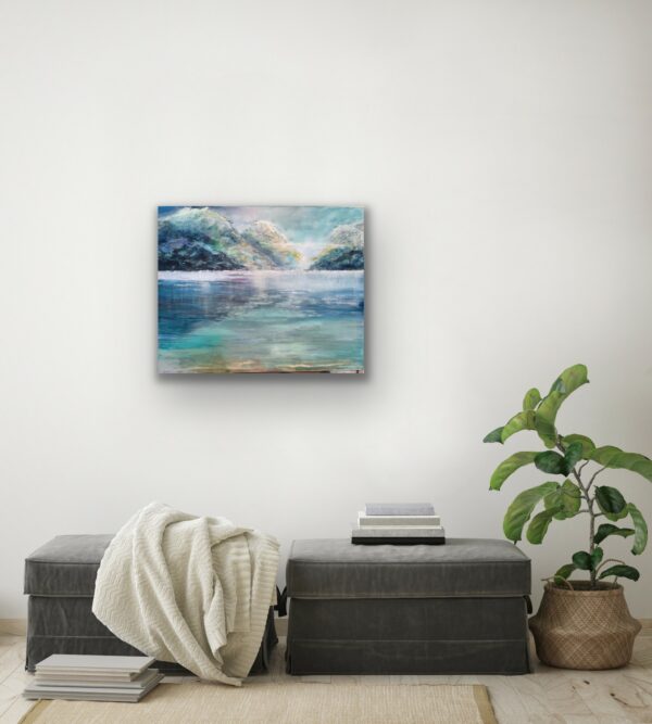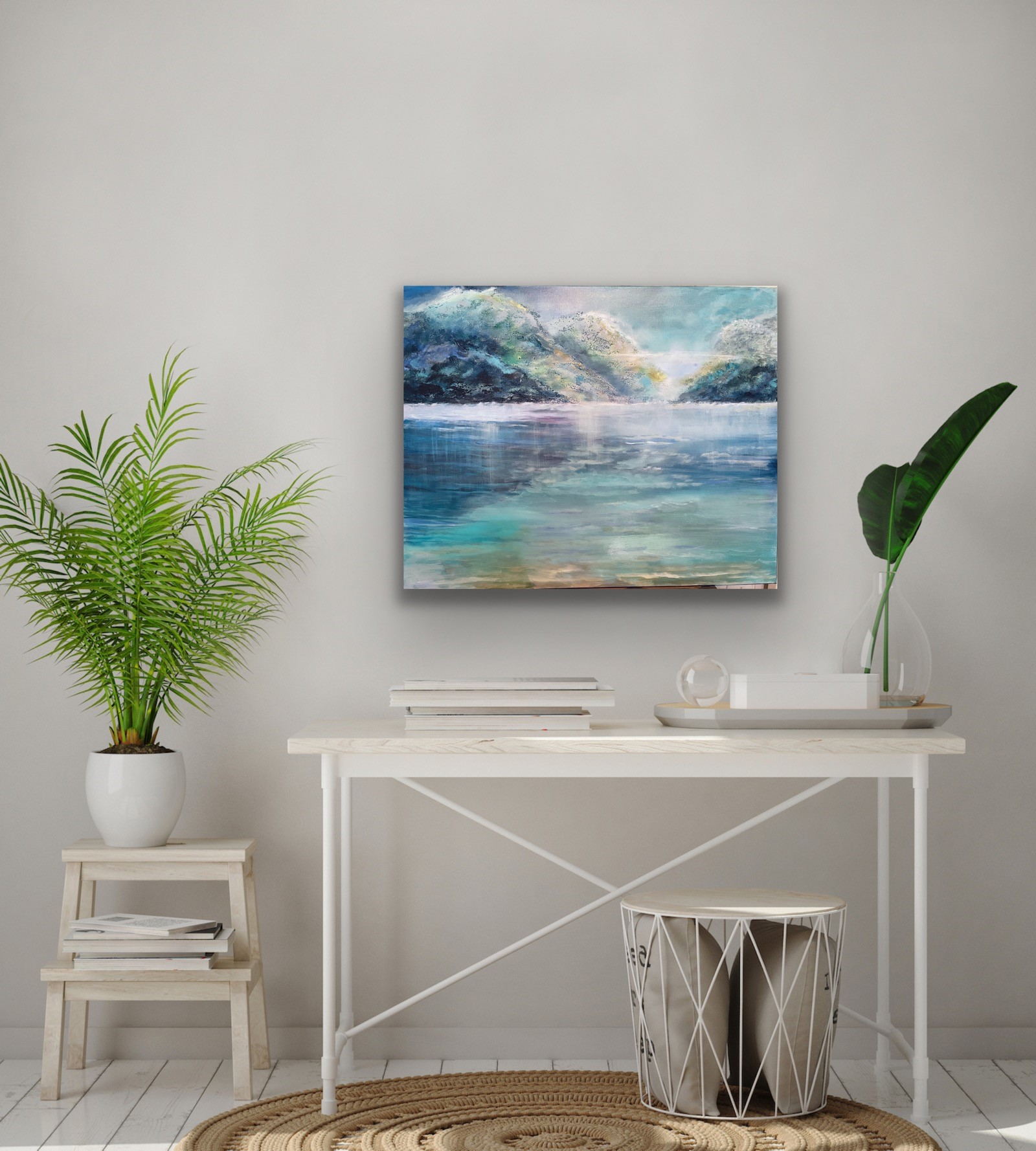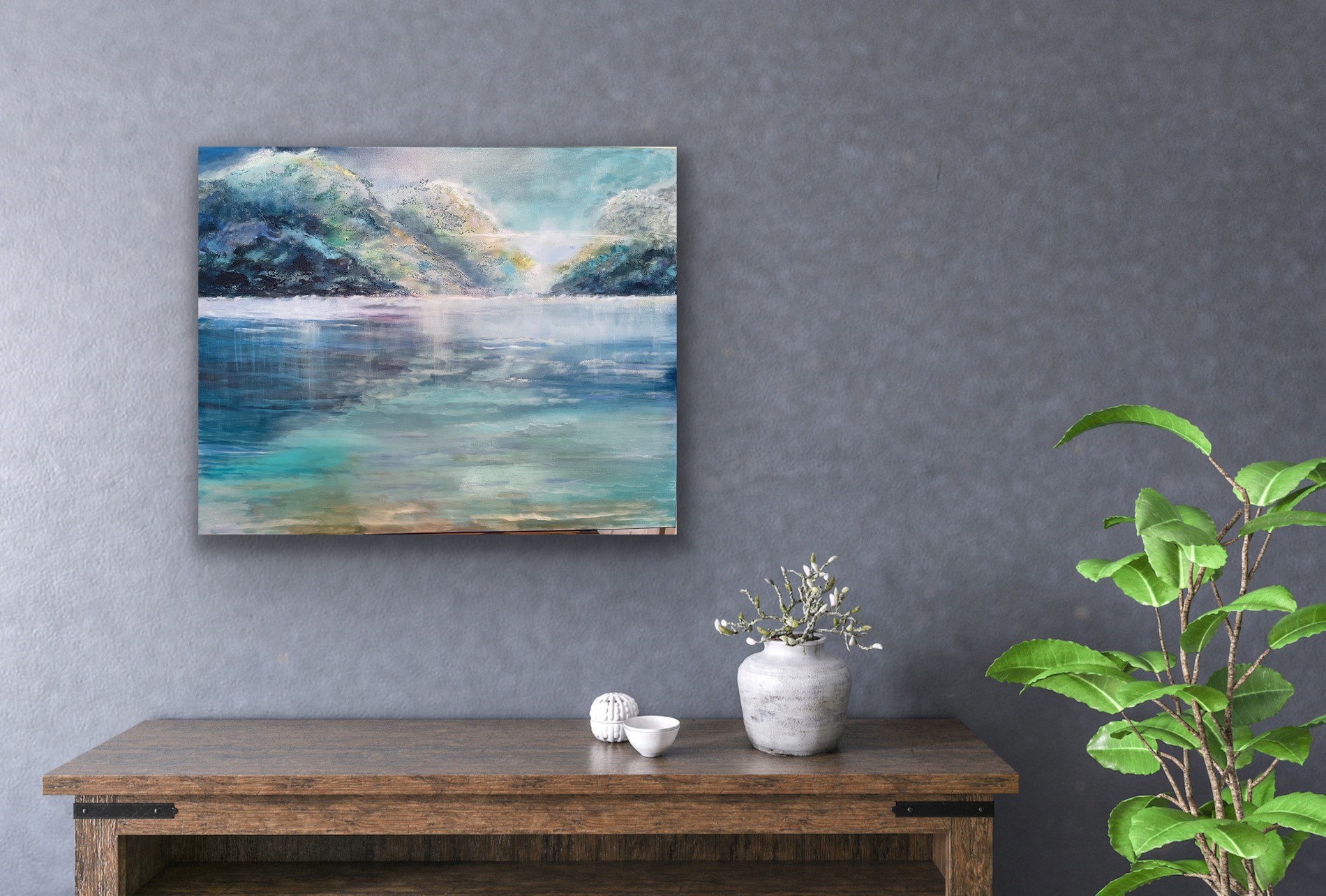 This extraordinary artwork is a one-of-a-kind creation, meticulously handcrafted on canvas with a textured surface. Measuring 30" x 24" x 1.5" (76cm x 61cm x 3cm), the artist's skilful brushstrokes and use of vibrant greens and blues effortlessly evoke a sense of tranquillity and serenity. The abstract interpretation of mountains and a serene lake invites viewers to immerse themselves in the beauty of nature, encouraging a moment of pause and reflection.