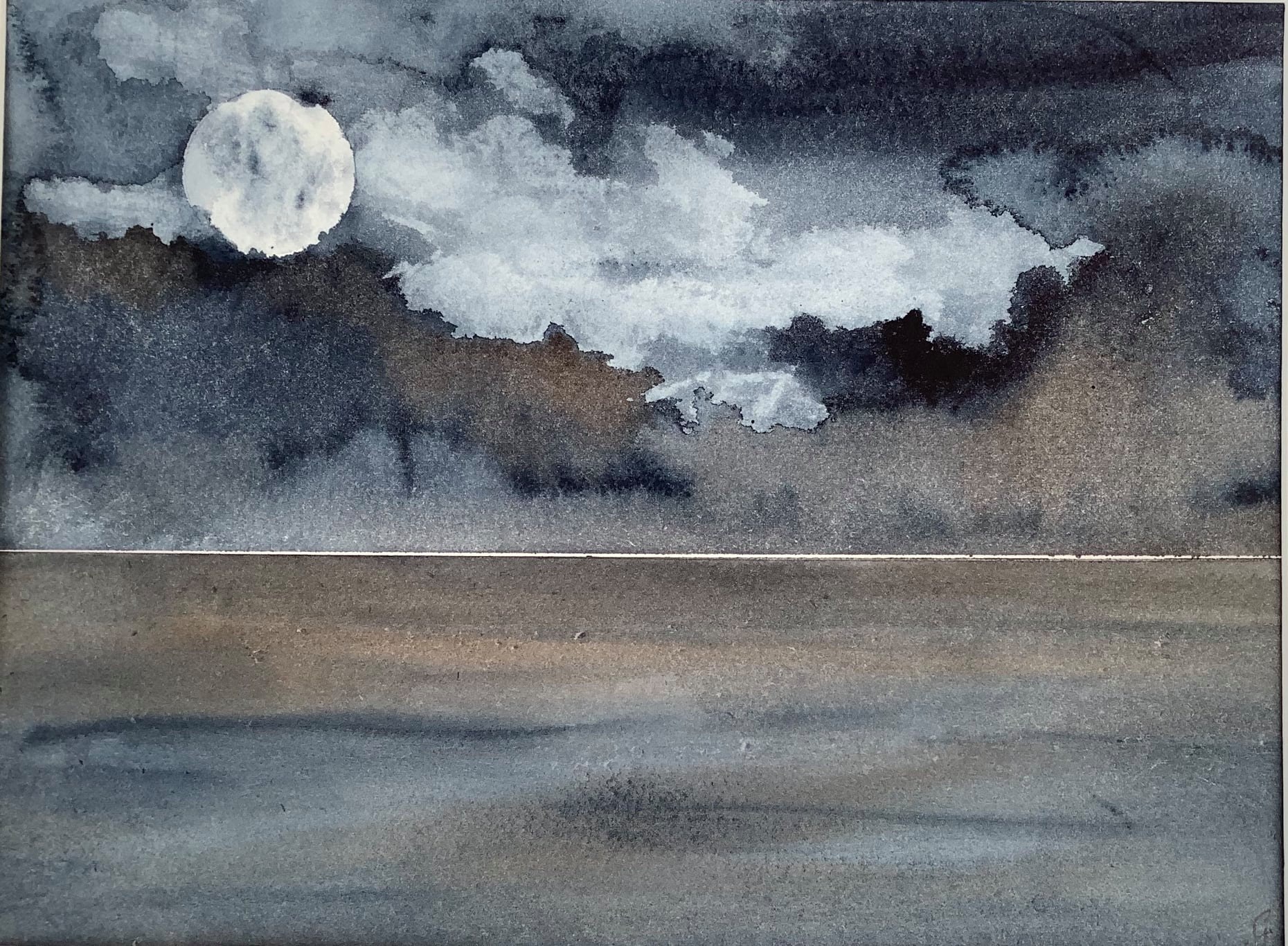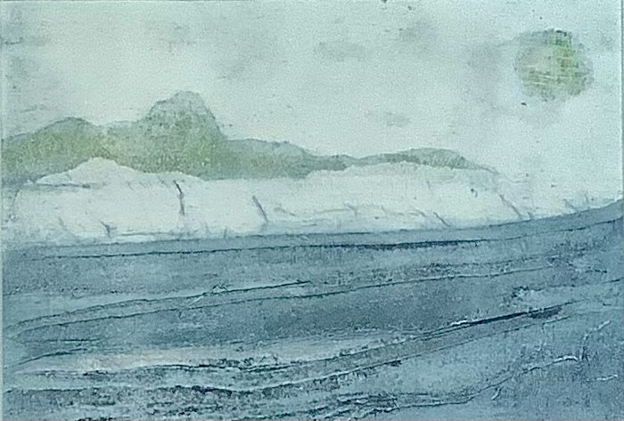 mixed media in semi-abstract style depicting sea, sky and land.