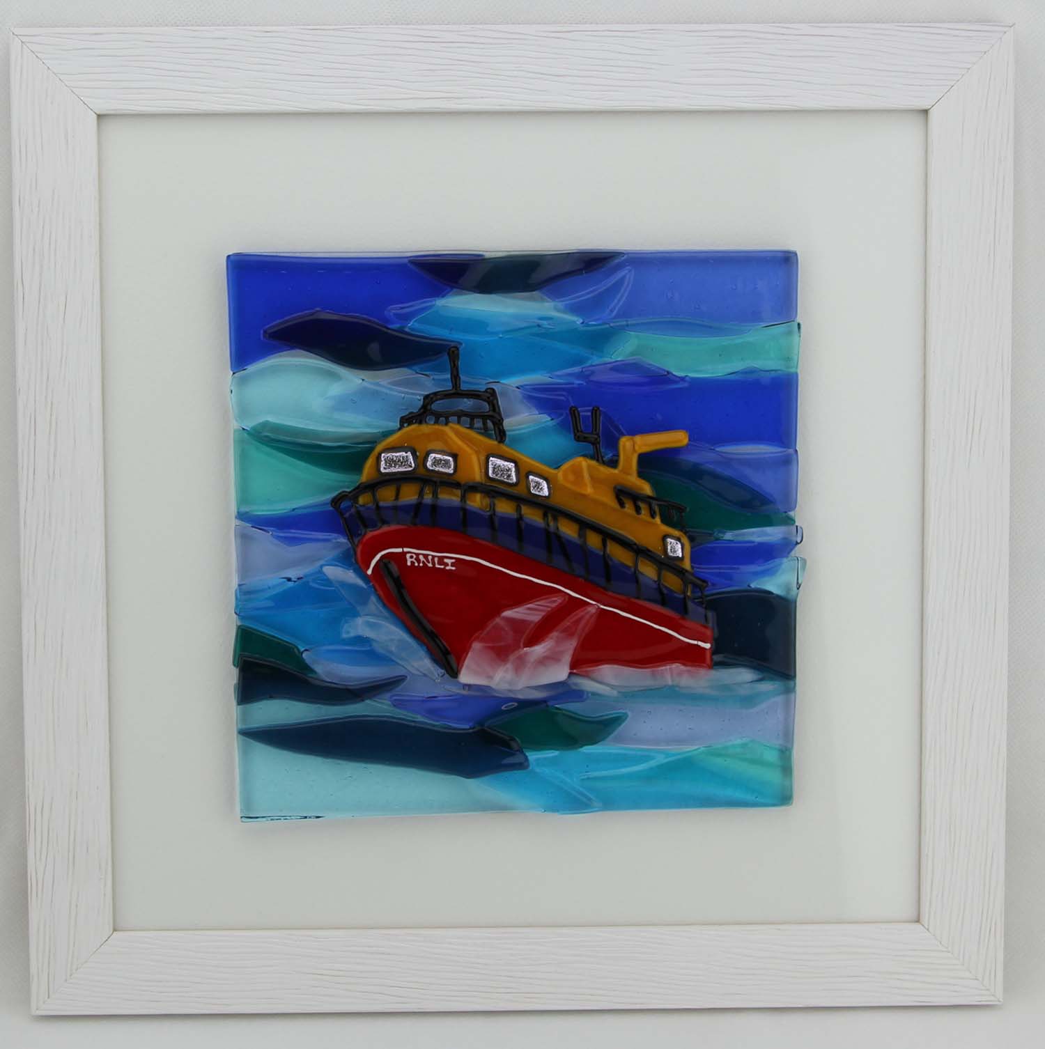 Fused glass presented in a white frame with mount. The glass panel has been hand-cut and kiln fired in multiple layers to create texture. "On a shout " is a depiction of the heroism of the crew heading out to sea in big bouncy waves.