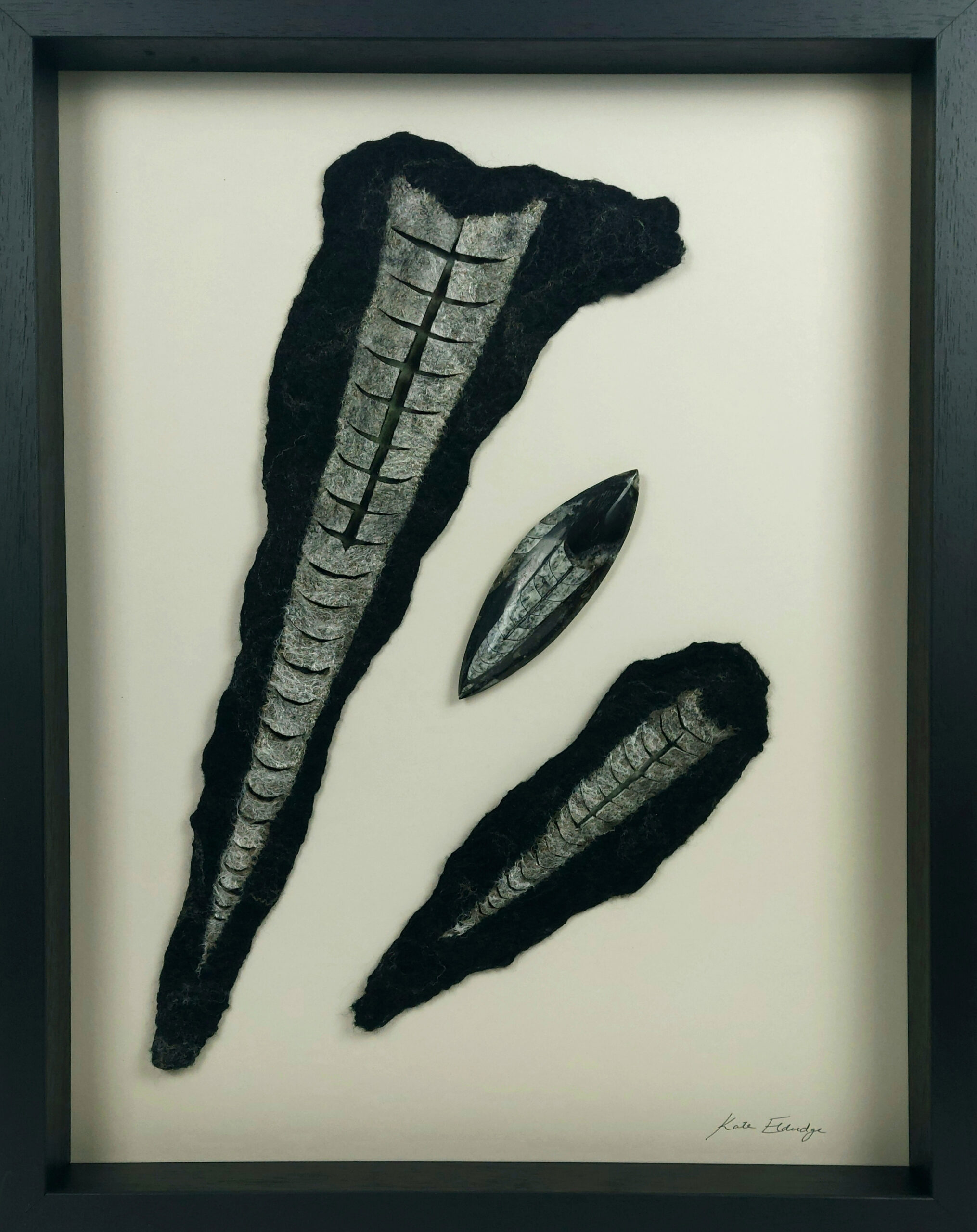 Study of an Orthoceras fossil specimen in wool and silk. Two felted pieces mounted with the original fossil.