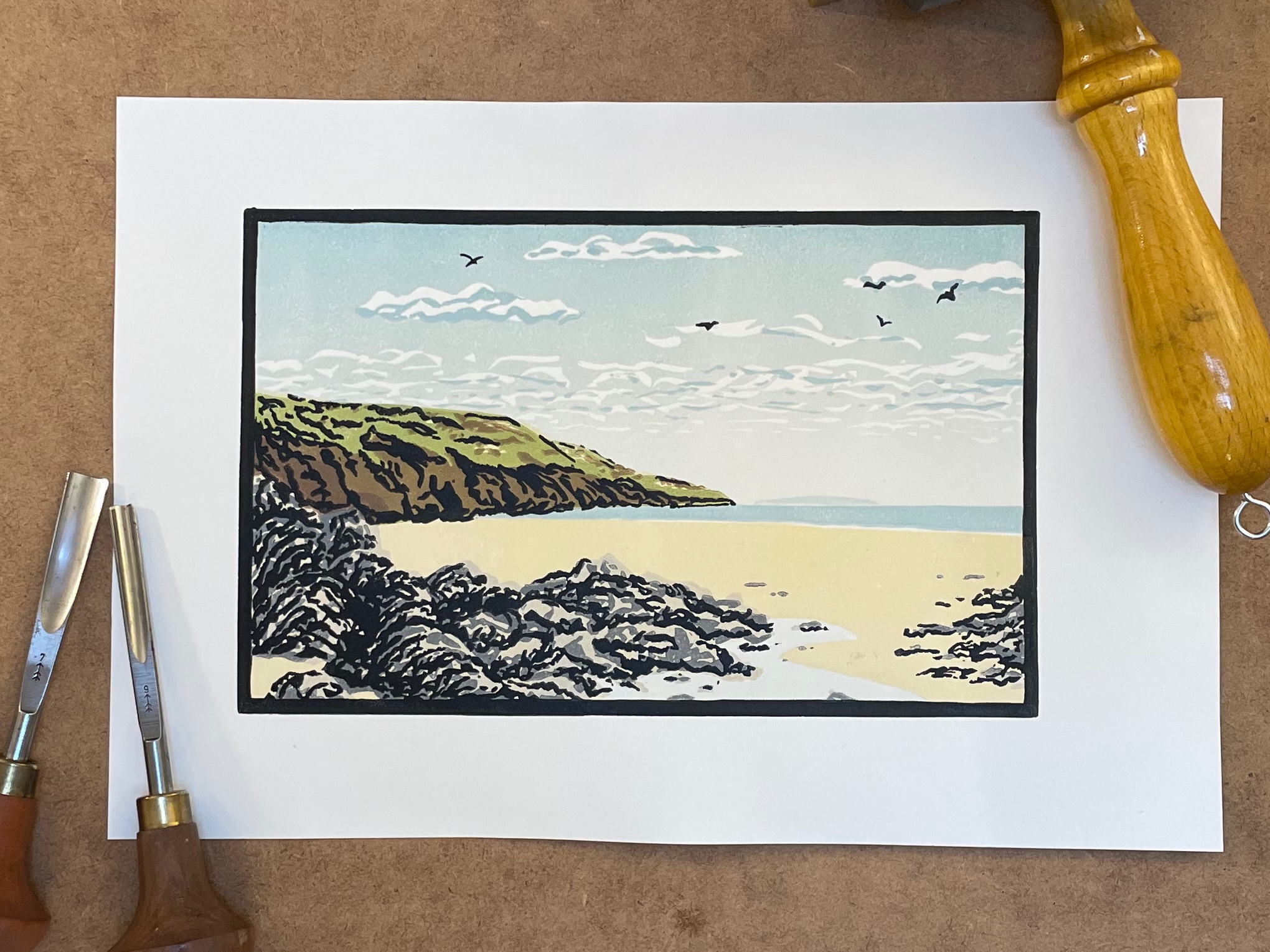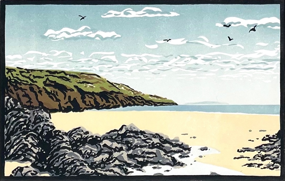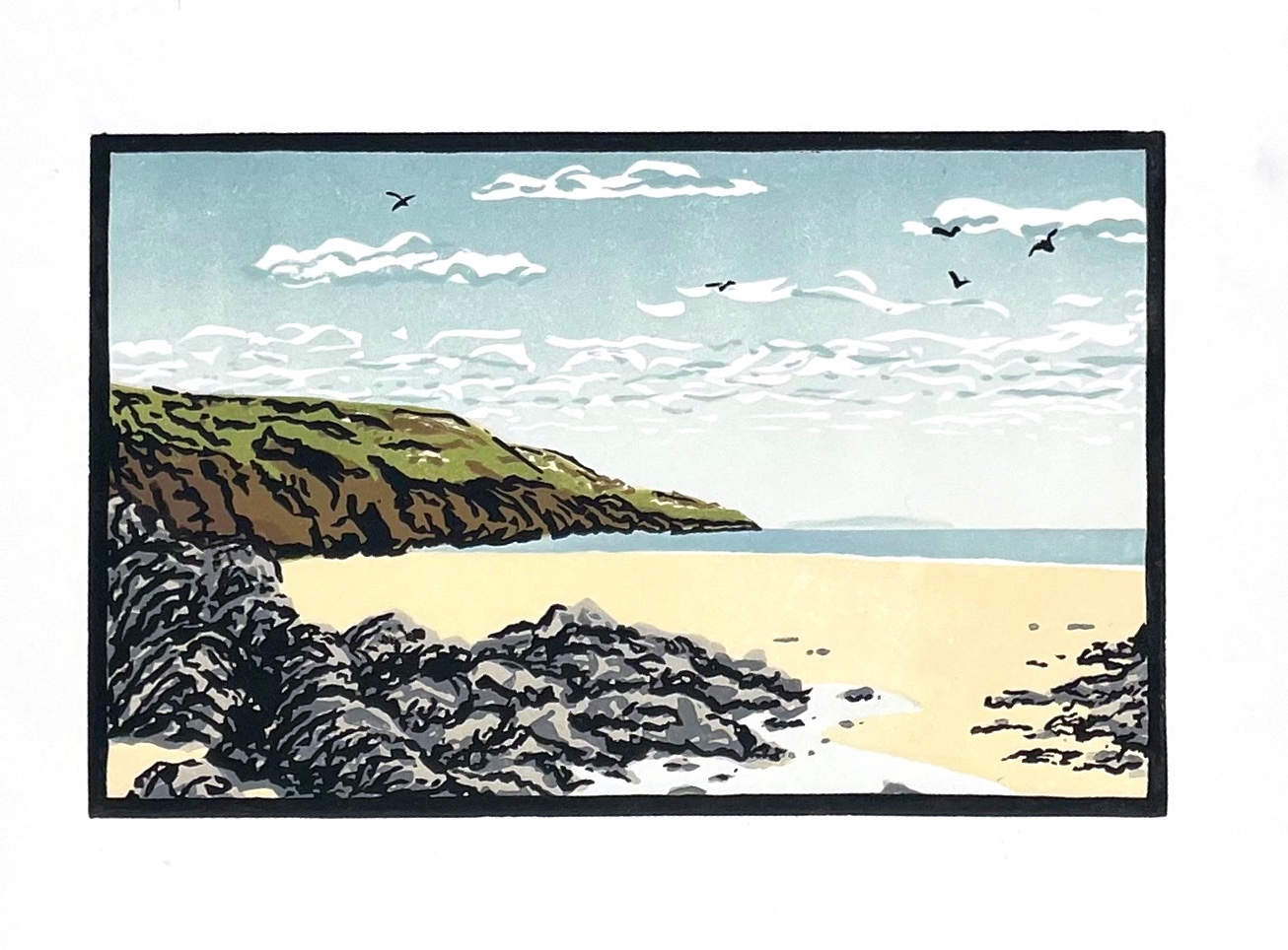 Handmade, limited edition linocut of Putsborough Beach in North Devon. The viewpoint is taken from between rocks at the back of the beach, looking across the sand towards the dramatic cliffs of Baggy Point and out to sea, where Lundy island is just visible in the far distance. Details - Image size is approx 13 x 20cm, plus generous border to allow for framing. - Limited edition of 40 - Each print is numbered and signed by myself on the front of the artwork. - Caligo Safewash printmakers ink, on 145gsm acid-free archival printmakers paper. - Multiblock technique.
