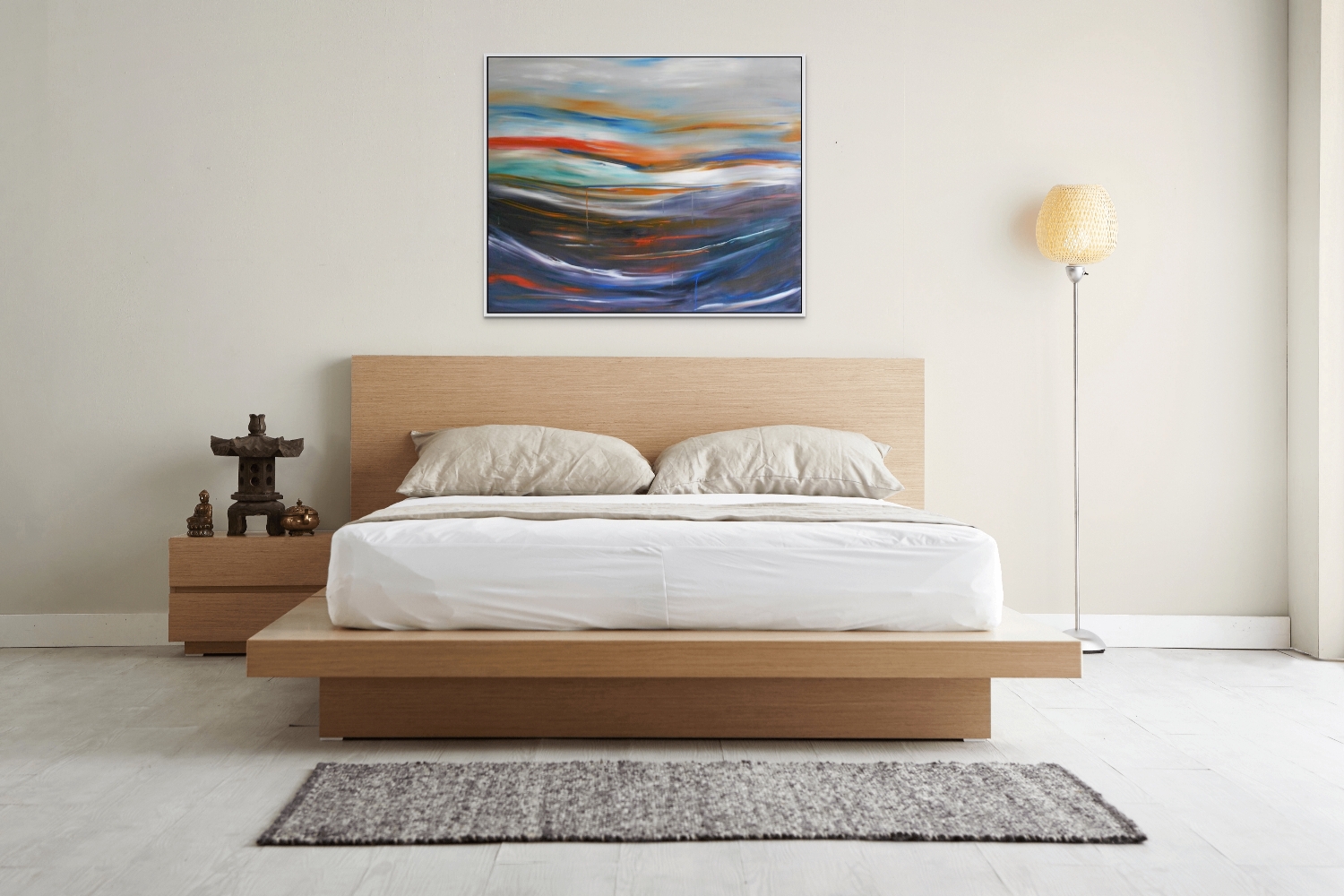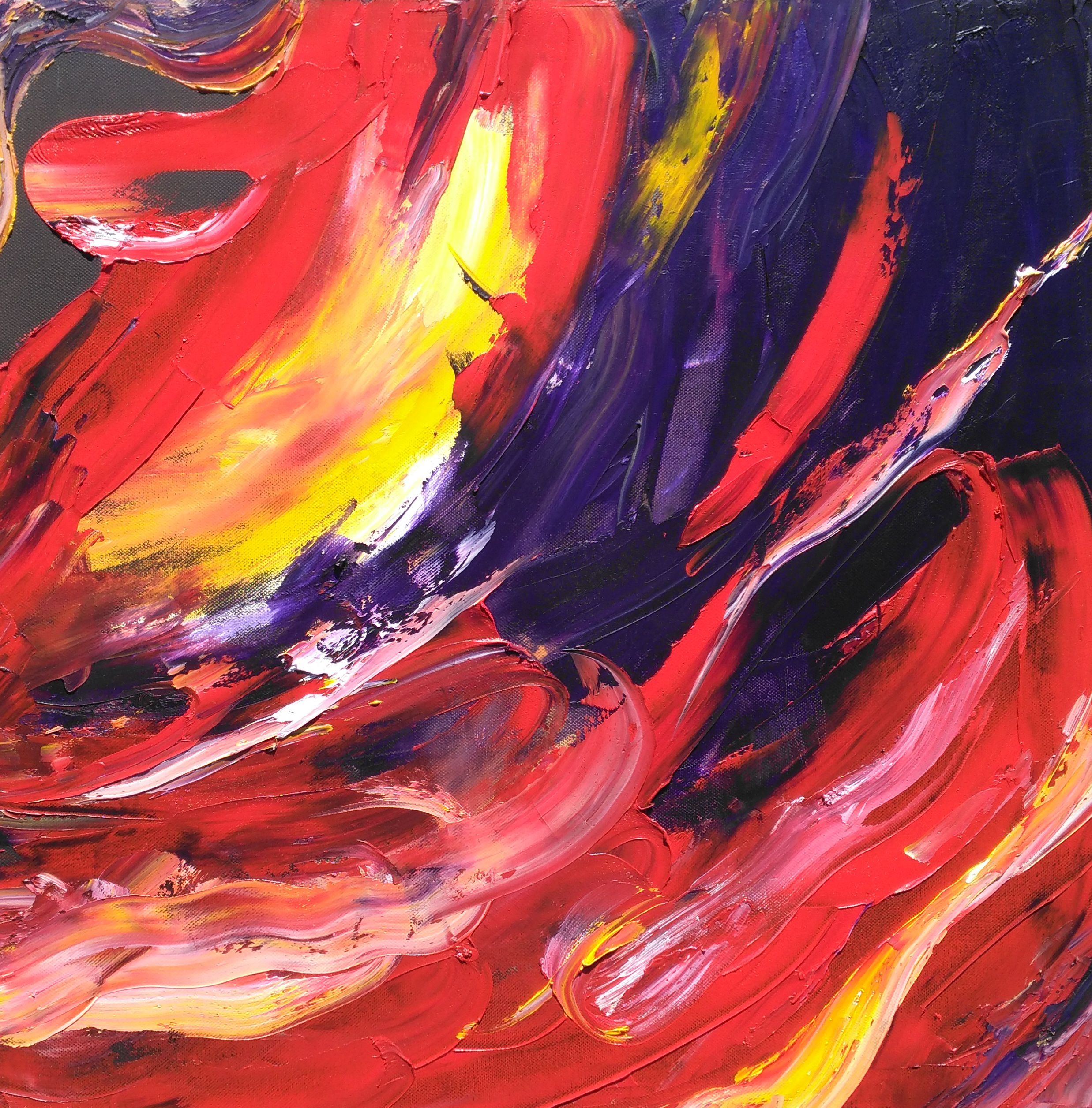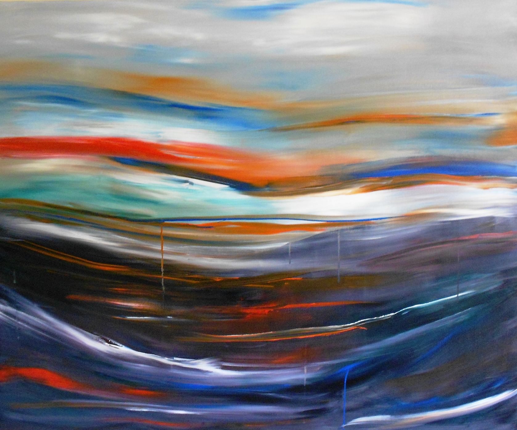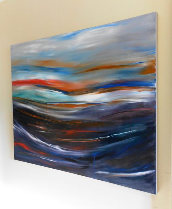 This abstract piece with make a statement in any space, domestic or commercial. With wide sweeping strokes of red white and blue, with hints of black, orange and turquoise, that merge and overlap to create a striking impression. Painted in acrylics on a standard canvas, for sale unframed with certification.