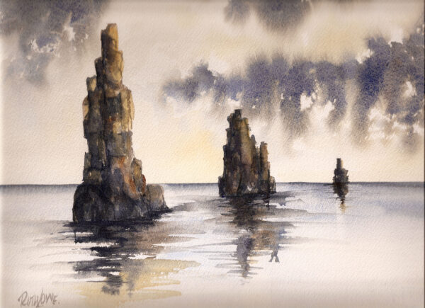 This is an original framed watercolour depicting an imaginary seascape. The colours and the composition come just from my mind and a wish to express a moody evening onthe coast.