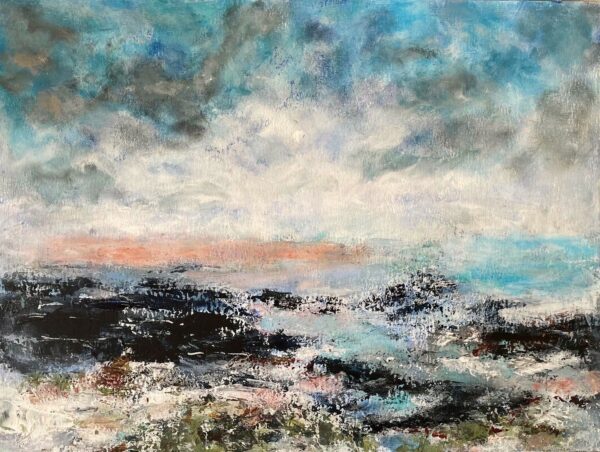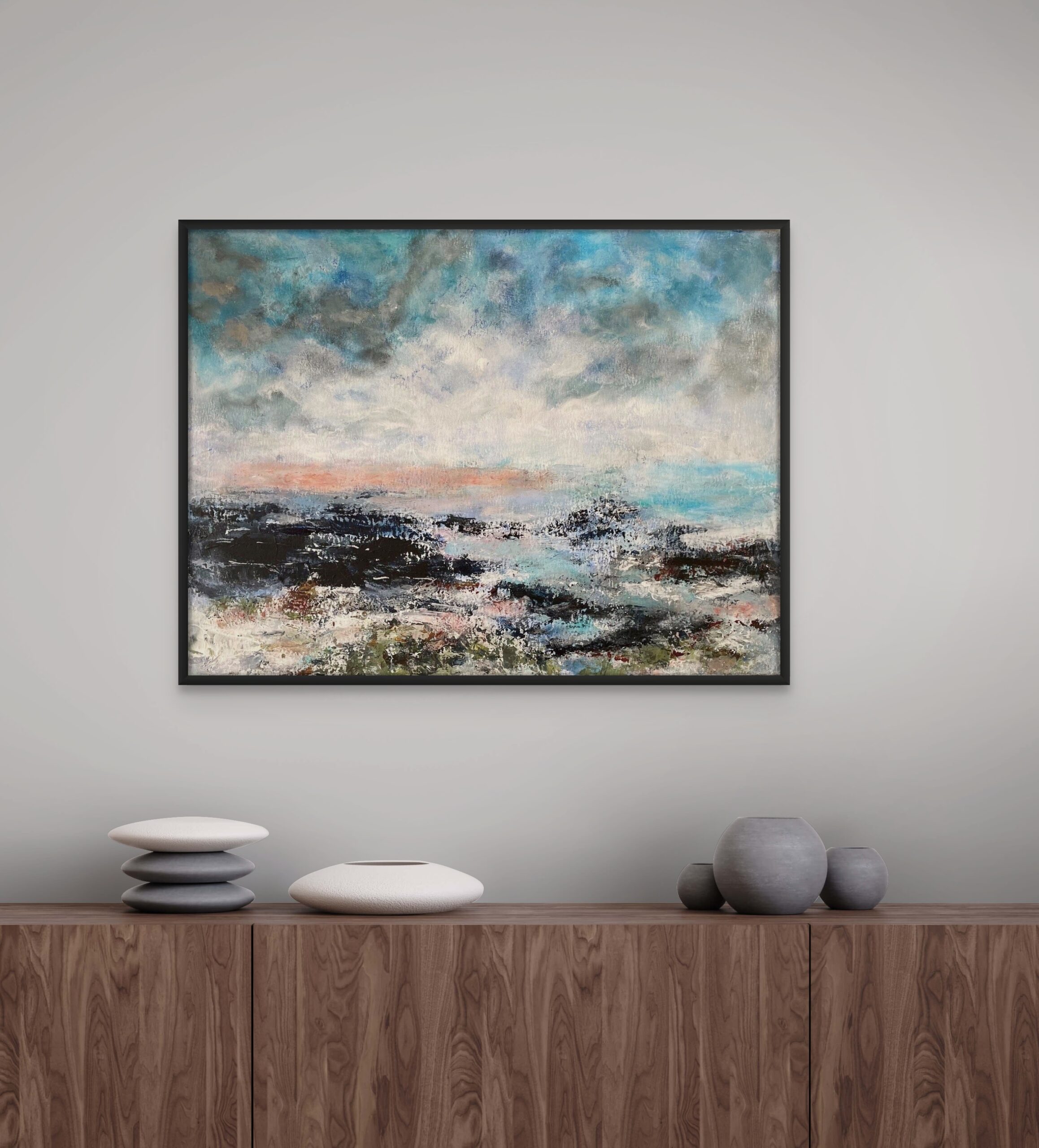 Rocky Cove is a semi abstract landscape inspired by the North Devon coast, tempting you in to paddle and explore the rockpools.