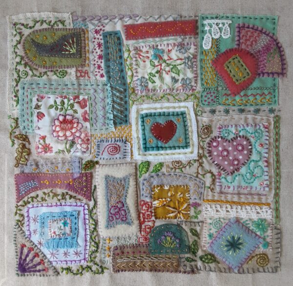 A patchwork style textile art piece, featuring hand embroidery and appliqué. An abstracted work evoking the colours, textures and sensations of an enchanting and beautiful garden ready to explore and admire.