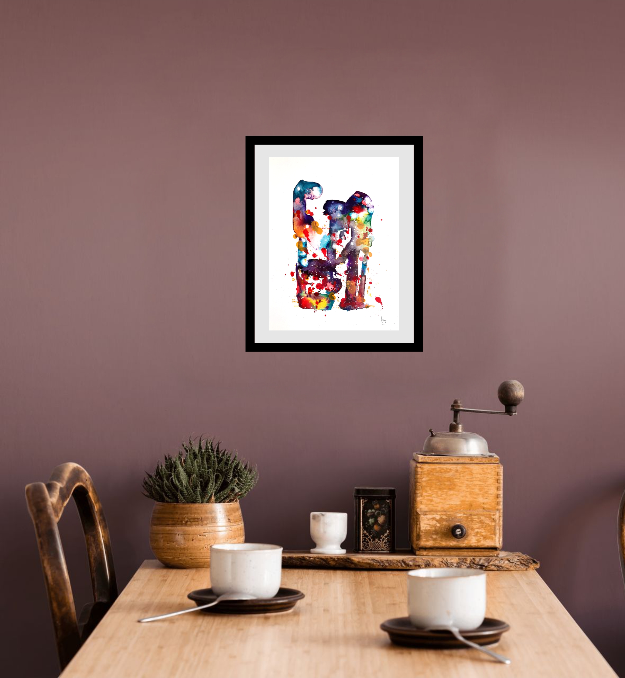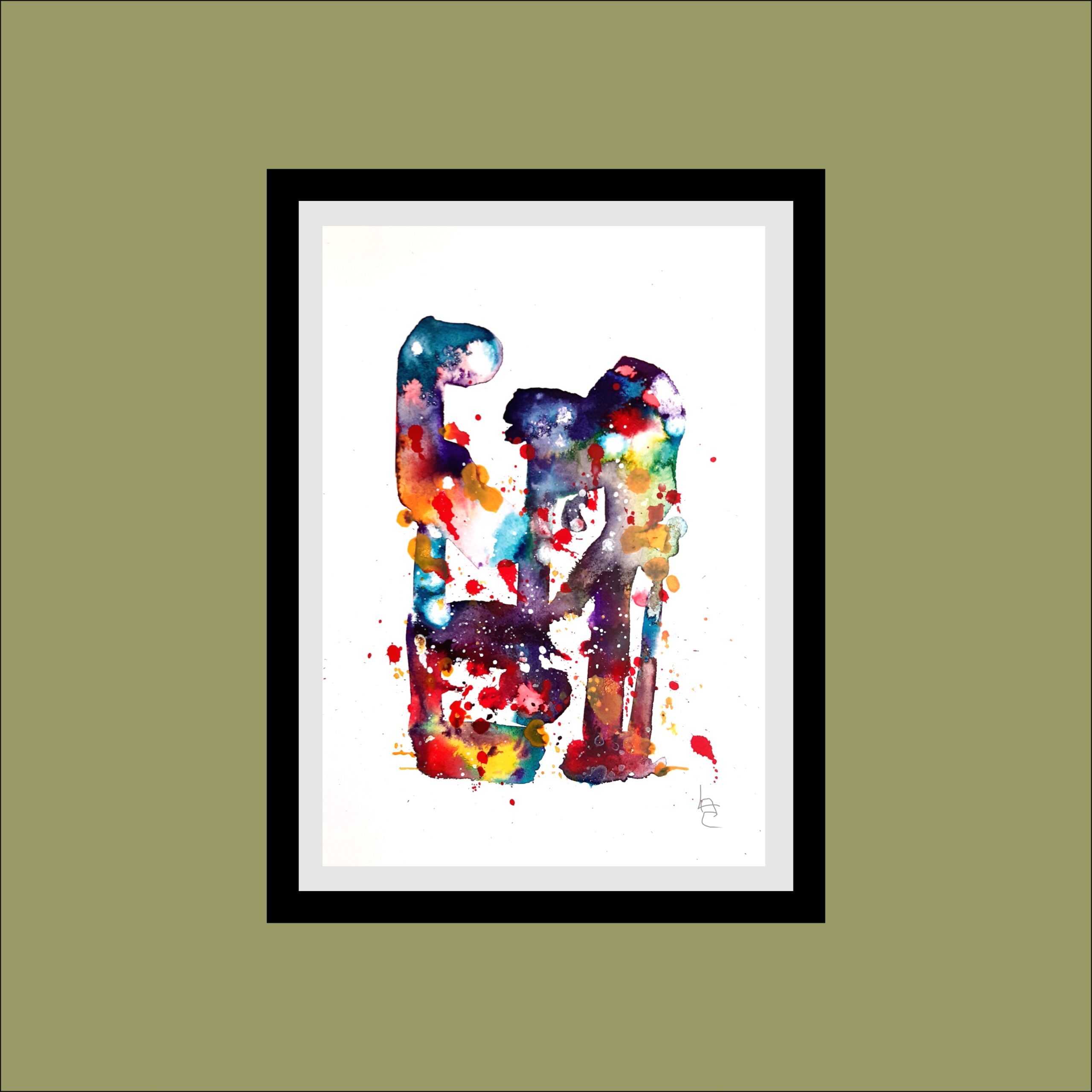 An abstract ink work, colourful figures that evoke clown figures. Presented in a 16" x 12" mount. Certification provided.
