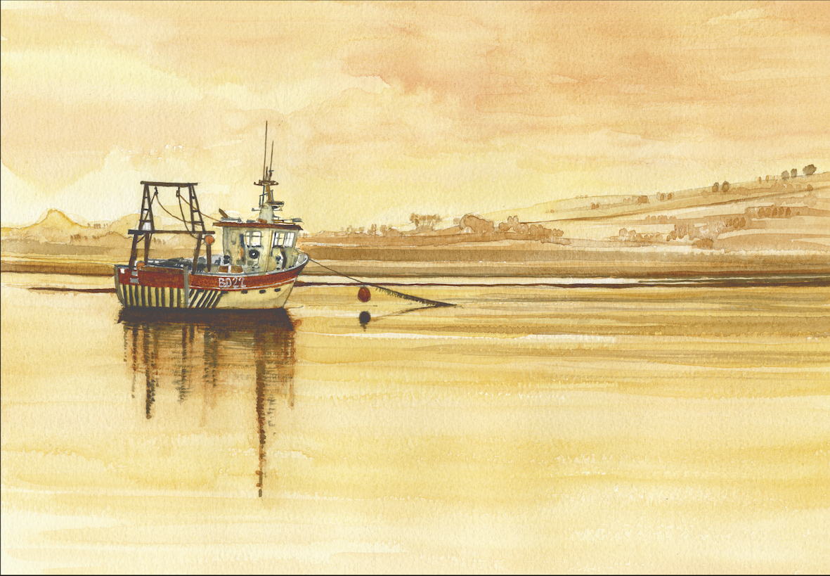 Mounted Watercolour signed limited edition print of Serene Skye Fishing boat at dawn on the Torridge Estuary based on a photograph reference by local photographer Terry Matthews of Appledore.