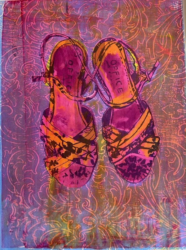 Photosilkscreen and paper stencils creating unique screenprint of one of my favourite pairs of shoes
