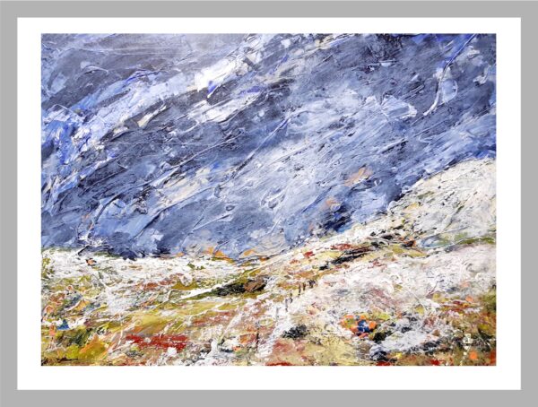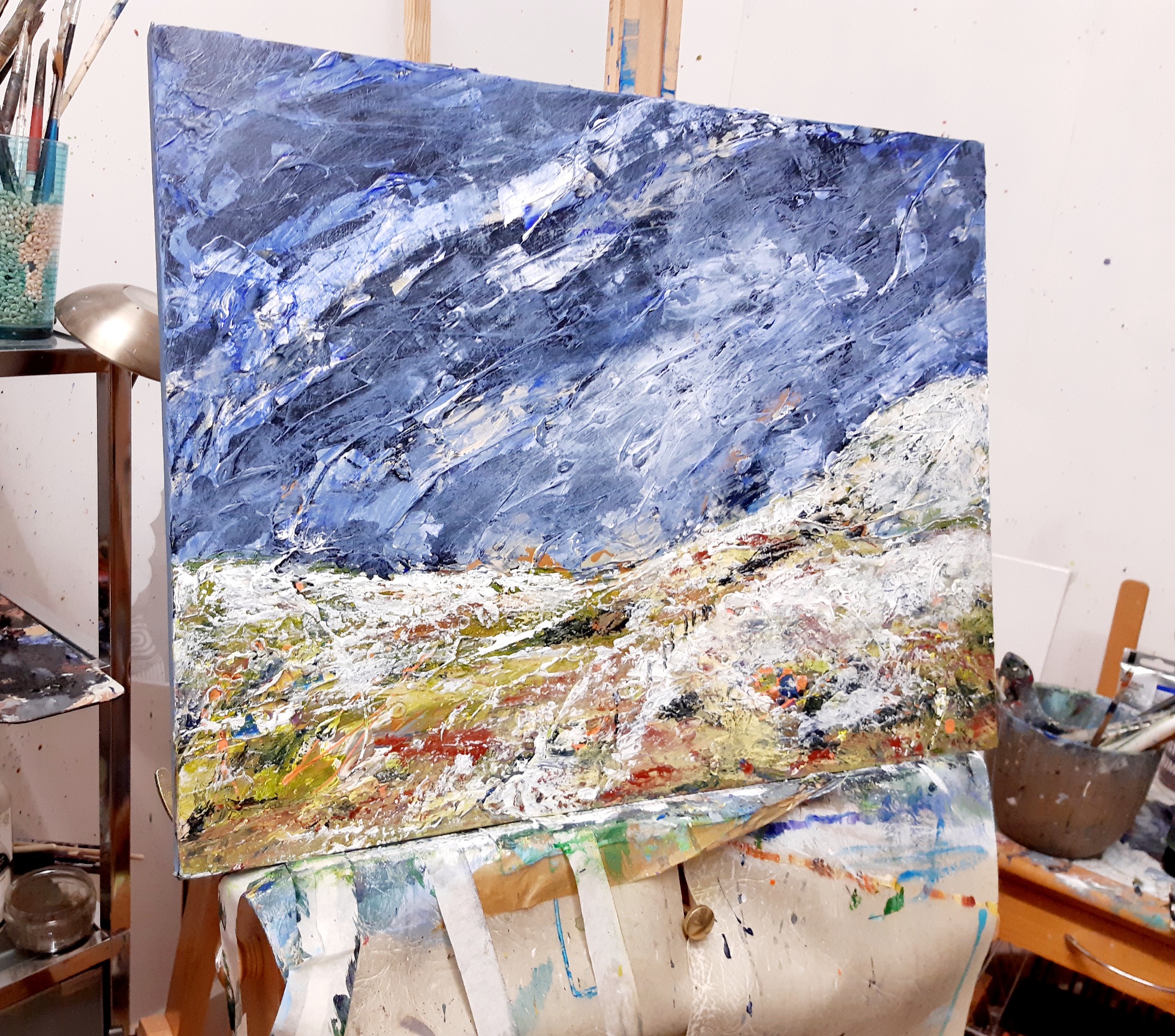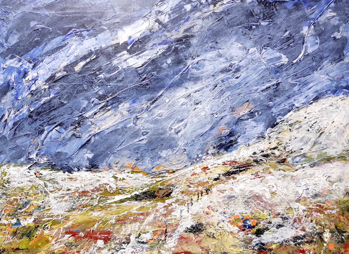 This landscape is painted with a pallet knife in acrylics. The moorland is shown with a dusting of snow, which covers the ground and fence line. A touch of gold adds highlights to the sky and hillsides. (cat No. BID1919) For sale framed, with Certificate of Authenticity .