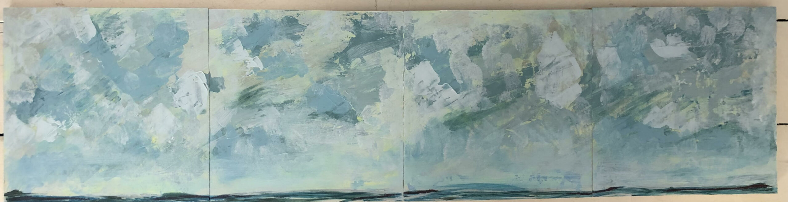 I love to walk along the coastline of Westward Ho! and Northam to look across over Crow Point to Exmoor in the distance. My work is inspired by this beautiful coastline and often contains a horizon with distant low hills.