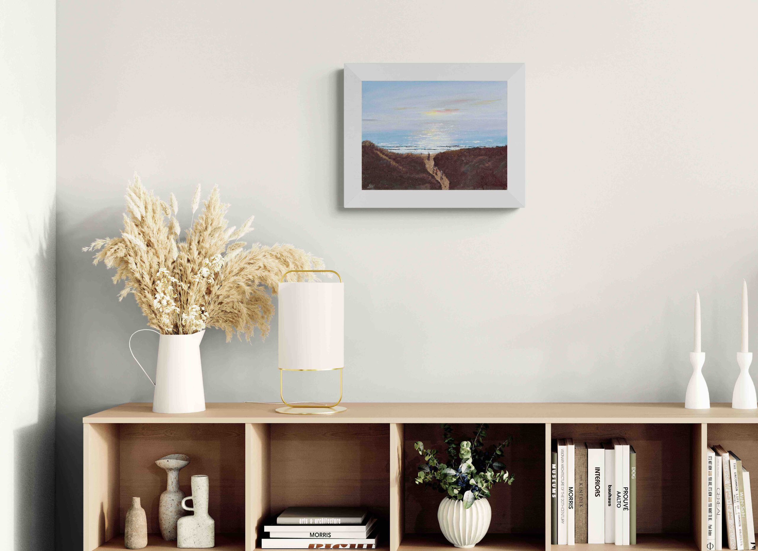 'Surfers, Woolacombe Dunes' was painted from Marine Drive at Woolacombe Bay, above the dunes that lead down to the beach. It was painted on the spot in one sitting with oils on a 16 x 12 inch stretched canvas. This painting is framed with a white, wood frame approx. 2'' width. Catching a light shift like this and looking straight into the glare from the sea creates quite a few challenges. The sun was high and it was late in the afternoon. The light was dazzling on the waves and the surfers became little more than silhouettes trudging up the hot, deep sand of the dunes. On the horizon to the left I could just about make out the island of Lundy through the summer haze.