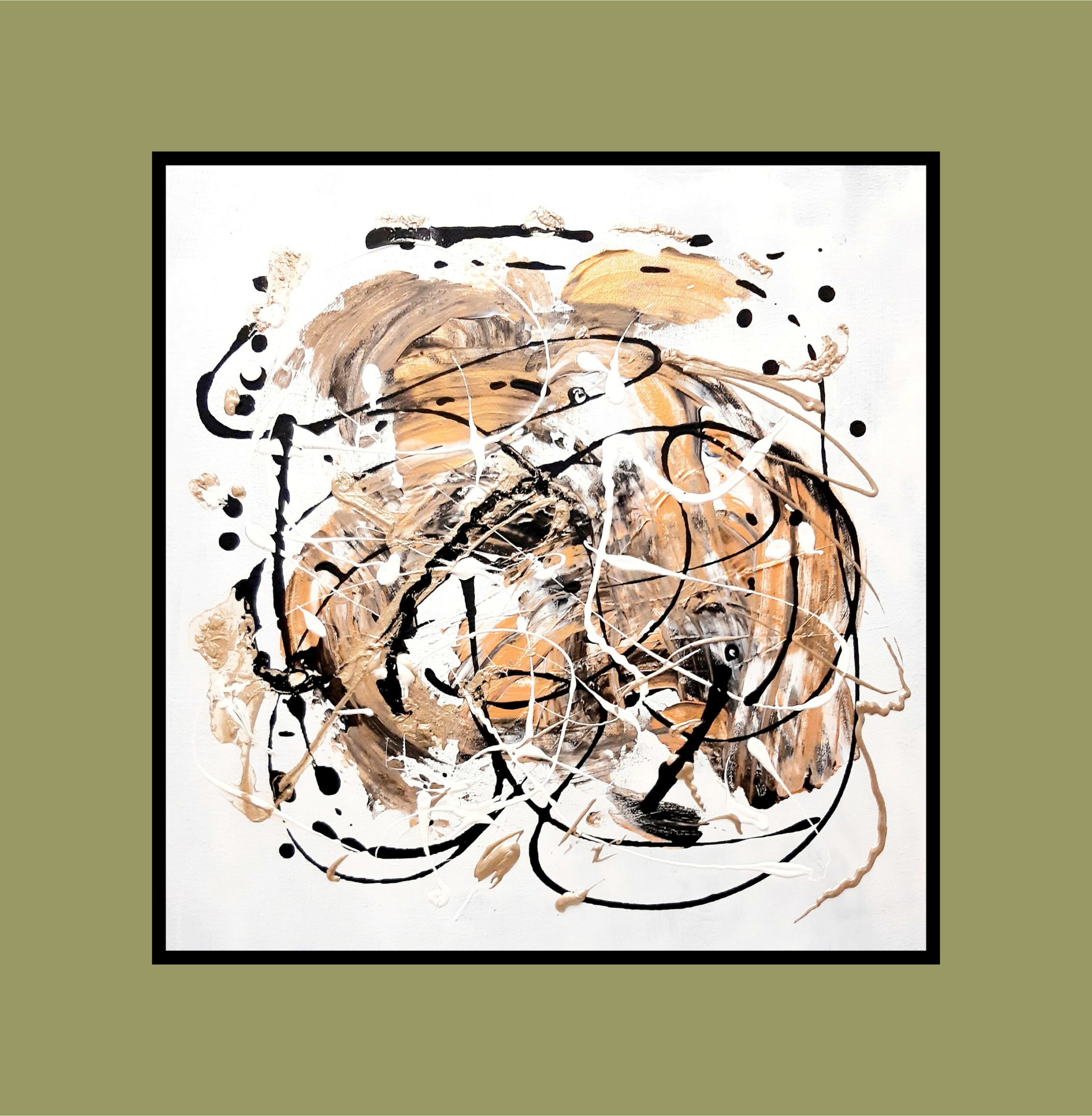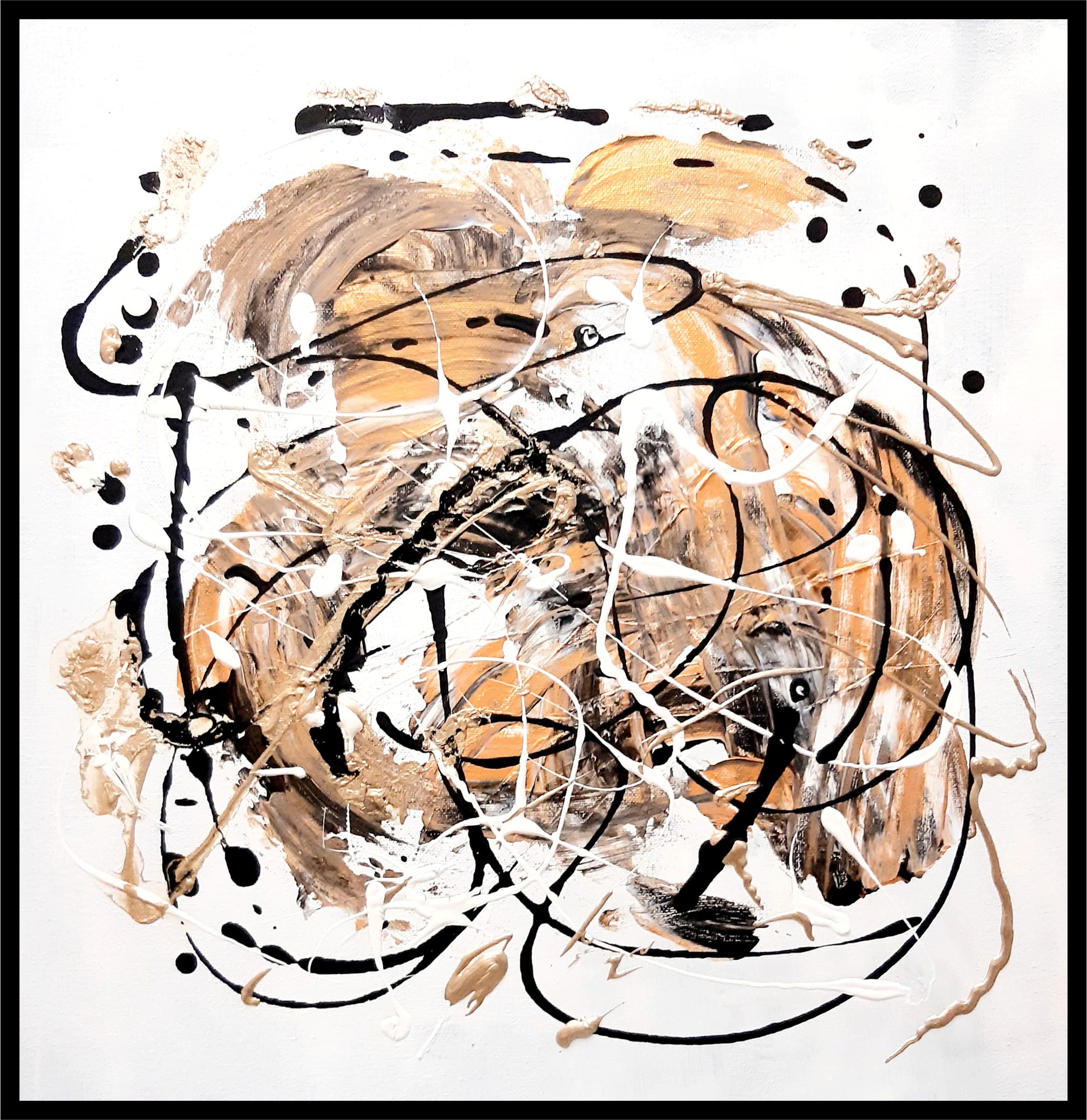 This abstract work is full of exuberance and life. Painted in acrylics on deep edge canvas, it expresses the artist's creative flow after a short break from the studio. Black and gold dominate a white ground, the edges are painted black.