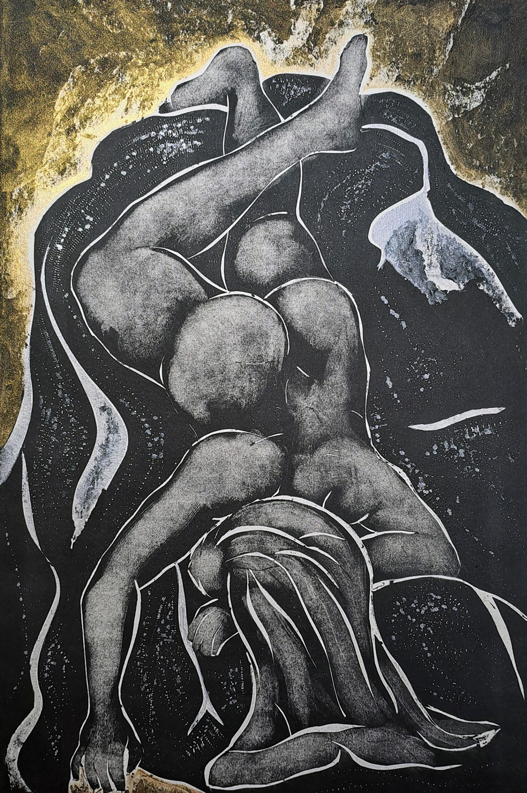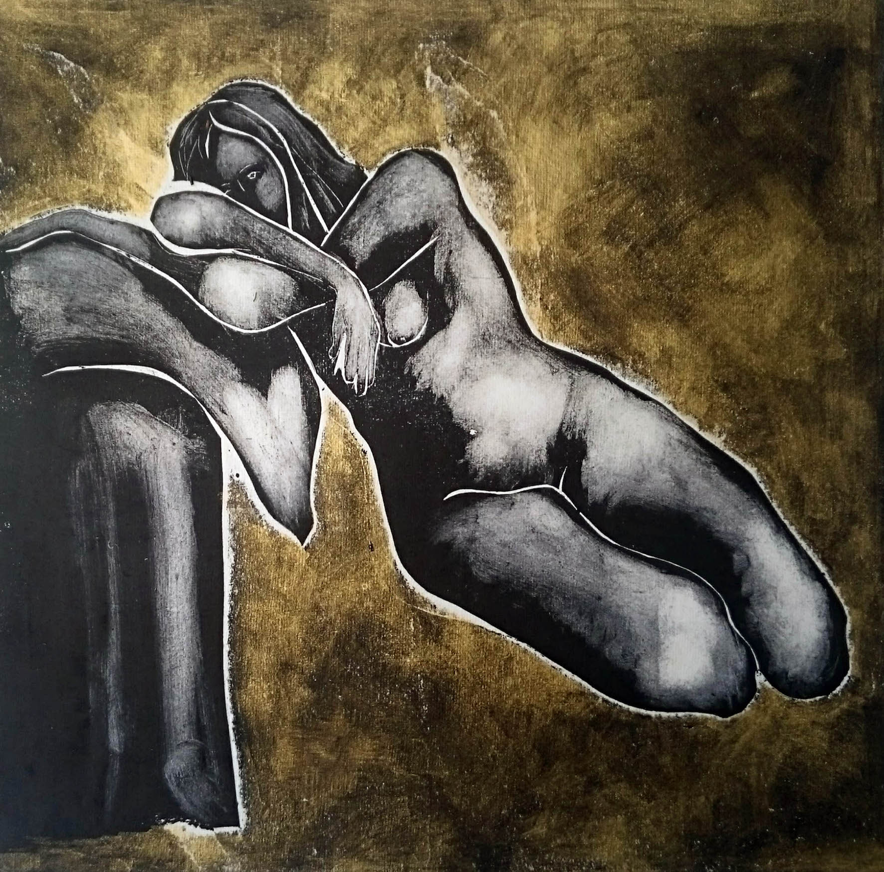 Aphrodite, the ancient Greek goddess of love, sex and beauty, born of the aphros: “foam,” of Uranus (the heavens) OR perhaps a feminine counter to the wrath of Titus Cronus? Rosie wants to depict women as thinkers, strong, singular entities not mother or queen or sex objects, able to indulge and be guilty of sloth, envy, lust or power and still maintain feminine beauty – sirens. Some titles connect to powerful women in history, feminist icons and femme fatale. Experiencing depictions of women in Degas delicate dancers and burlesque bathers, Rodin’s fallen in the gates of hell and sexualised drawings of women: Gustaf Klimt, Egon Sheila and Eric Gill; Henry Moore’s gigantic queens and powerful mothers cradling infants reinforce the same depictions investigated in Archaeology. Rosie’s prints allude to the depiction of form through line: influenced by the women in Picasso’s blue period drawings and reductionist line drawings by Matisse. More recently, Rosie has associated her Siren prints with goddess figures, from different global and historical contexts. Image size 35cm x 28 cm - framed size 50cm x 43cm (approx) Monoprint, edition of 5 - cardboard cut, water based inks and with gold and silver glaze, paper. cm RRP unframed £350.00, framed £400.00.