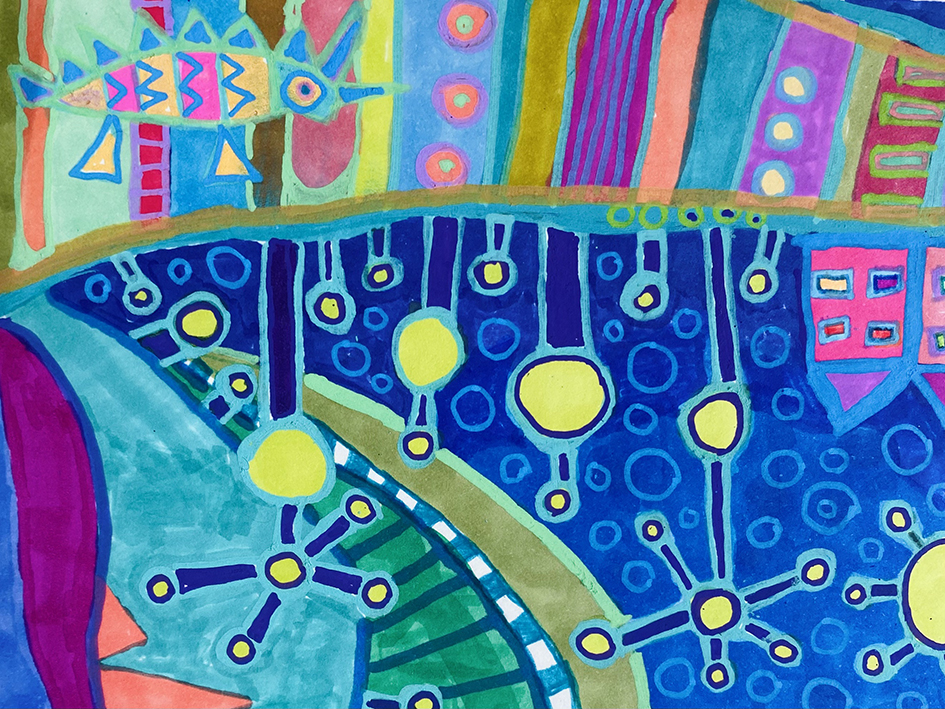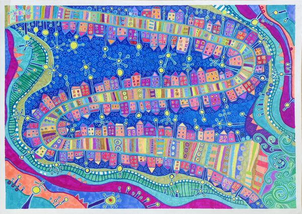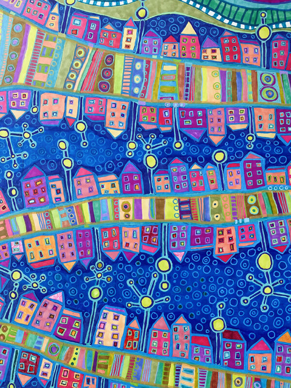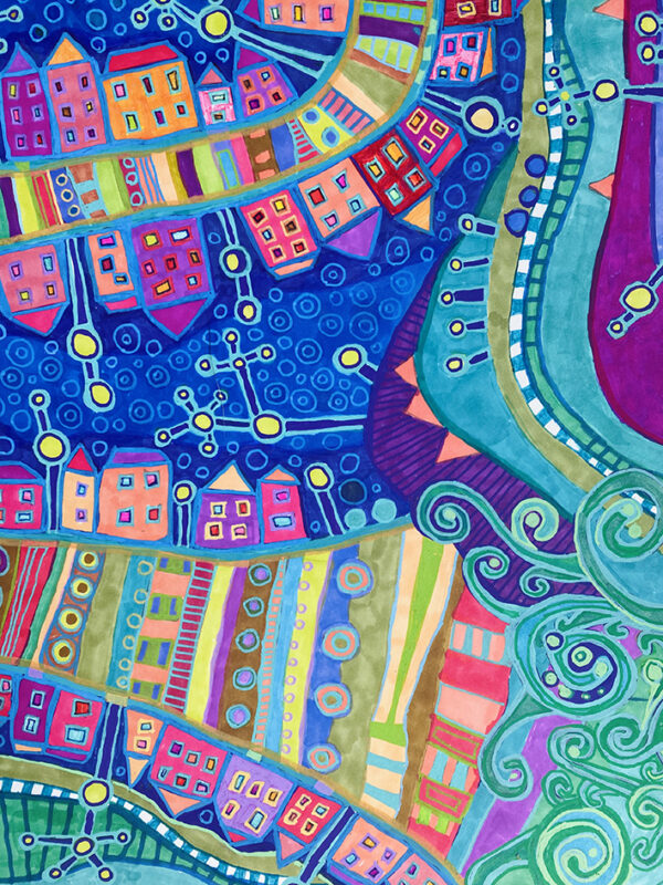 A portrait of my Village - Combe Martin. At one end of the village there is a dinosaur theme park & zoo, at the other end is the sea. If you know where to look you can see my house. Drawn with acrylic, fine line and marker pens.