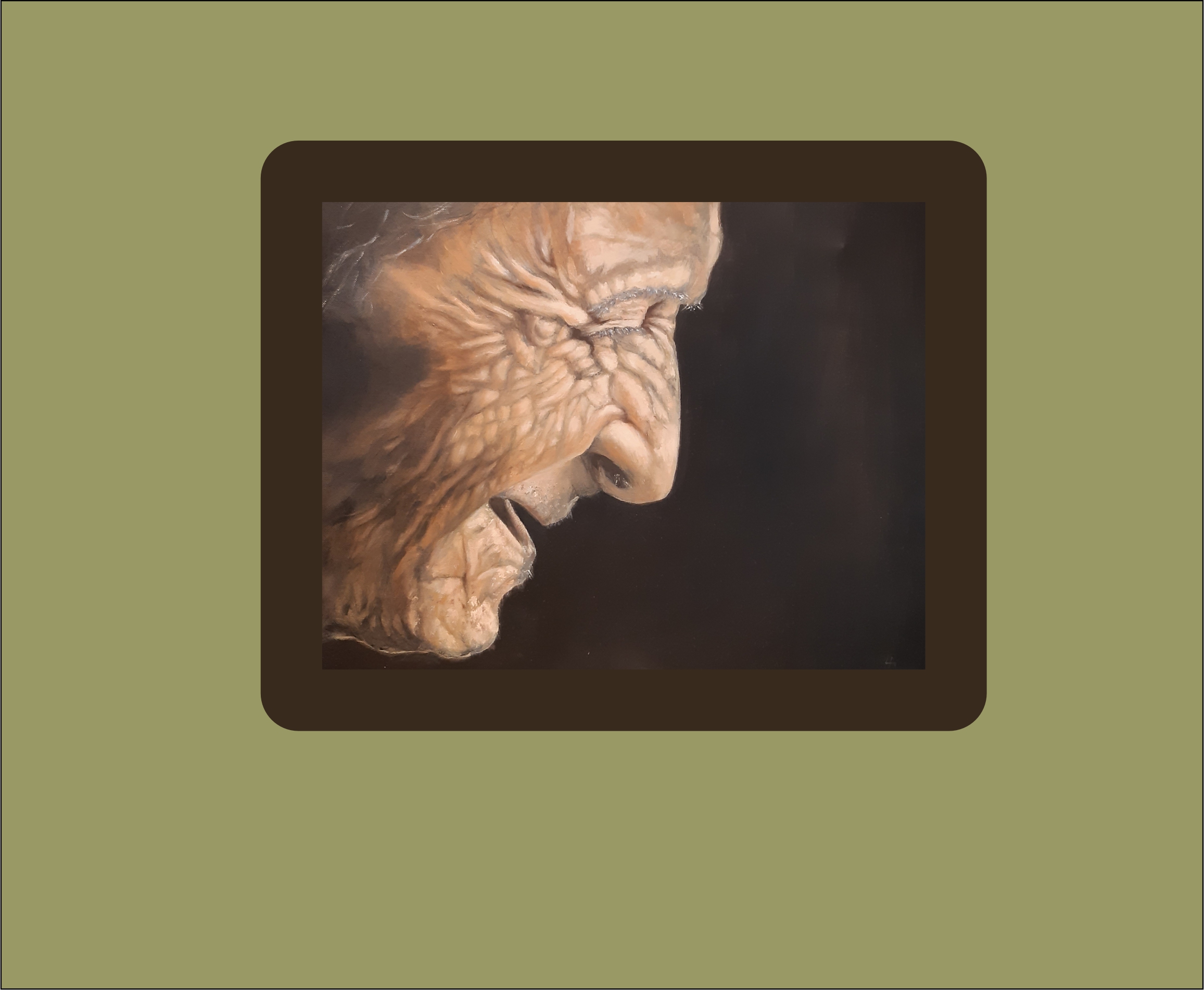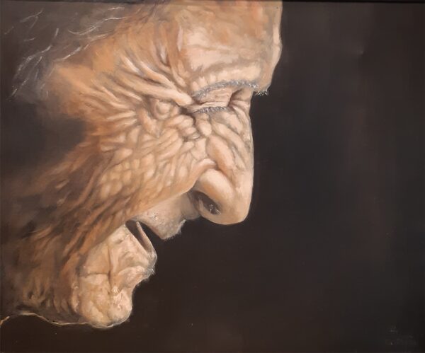 This is a portrait in oils of an elderly gentleman, savouring the last drop of a good scotch or a pint. With a lifetime of experiences showing in every wrinkle, this face is full of character. For sale in a dark mahogany coloured frame, with certification. Dimensions shown plus frame.