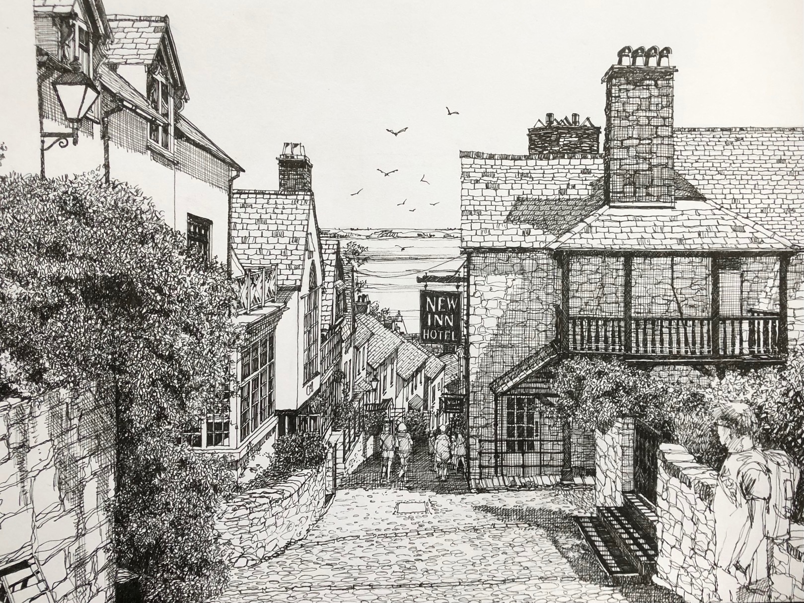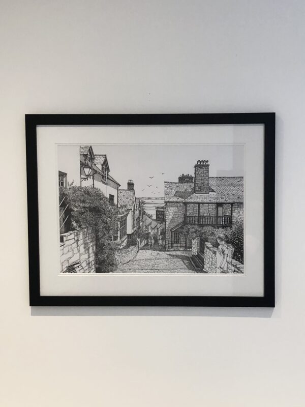 Framed matt black square edged limited edition signed print ink illustration of the view looking down into Clovelly from the main cobbled footpath, capturing the New Inn Hotel .One of the most instagrammable views in the UK