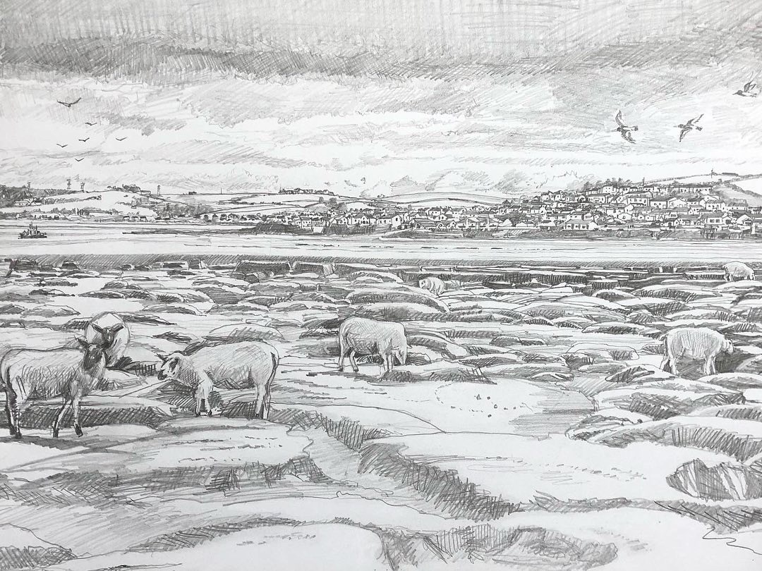 Limited edition signed and framed in matt black print of Sheep grazing on the naturally formed Tussocks on the Northam Burrows biosphere area of natural beauty across to Appledore North Devon.