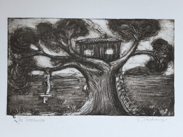 This unique original drypoint etching in sepia tones depicts a treehouse from a mixture of childhood memories and imagination, and was inspired by an exhibition I went to in celebration of trees, exploring our relationship with and connection to trees and woodlands. The style of the work reflects atmospheric sepia photographs of the past, and has a timeless quality, being equally at home in the distant past as well as the present. The artwork is on heavyweight Snowdon paper.