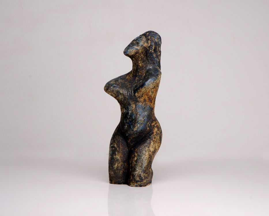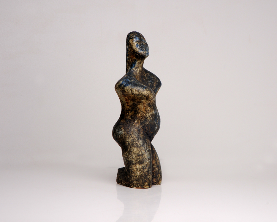 A very unusual figure with the feeling of a totemic icon which is amplified by its darkness, although this is underpinned by a fabulous cobalt blue. The texture is quite gritty and energising. I wanted to find a way of making an abstracted female figure with a strong presence. The suggested head enables a focus on the form of the body. I love it in it's strangeness!