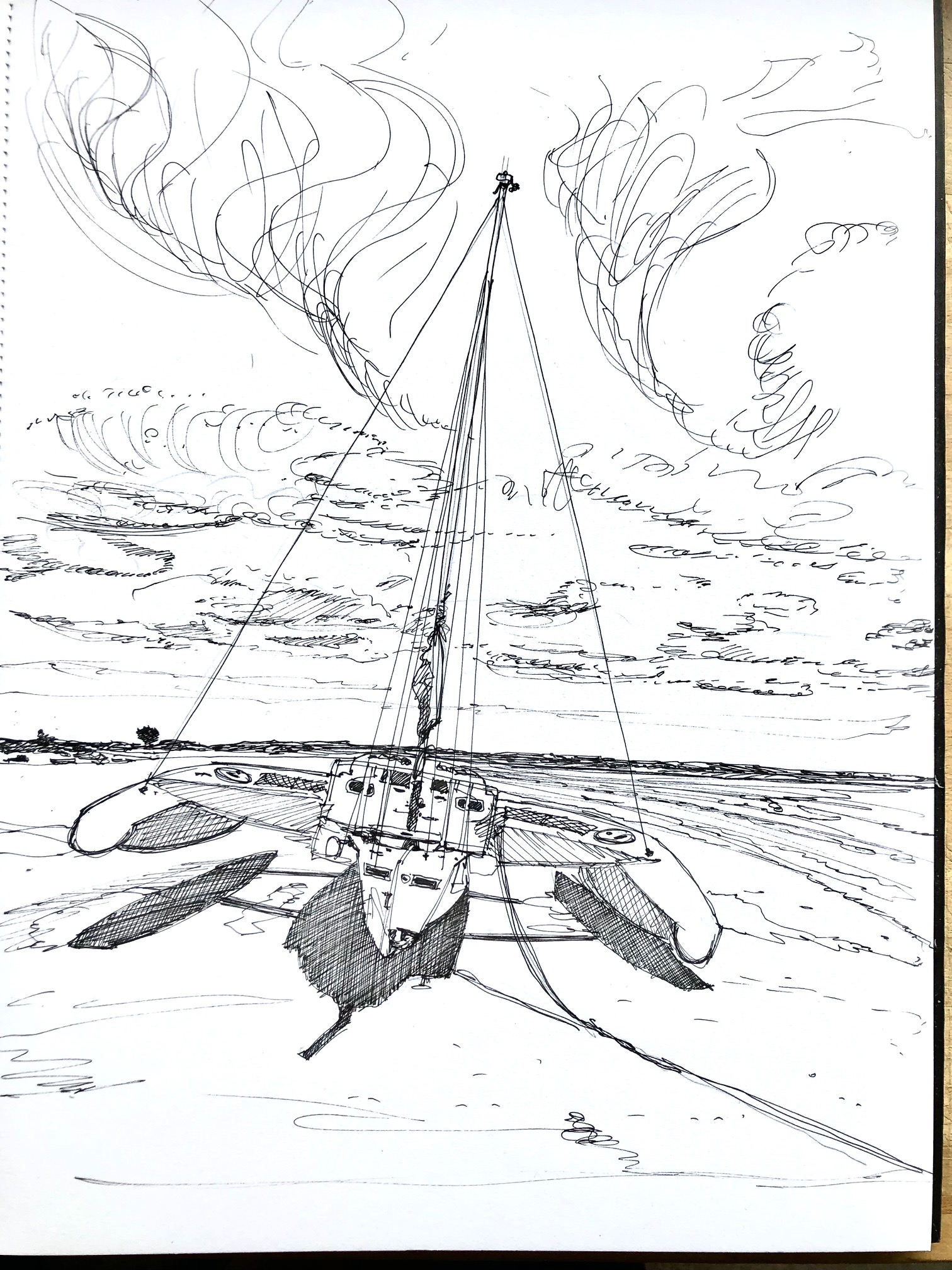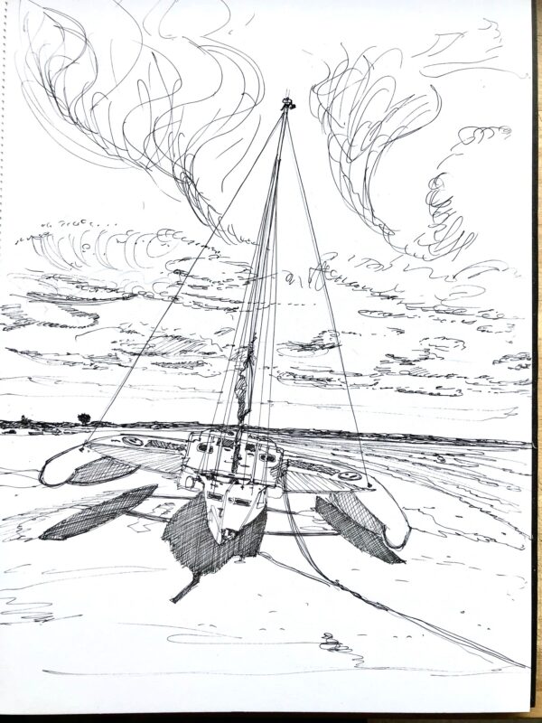 Framed square section in black & double mounted original line ink sketch of a Trimaran at Velator Crow Point by Braunton in North Devon during low tide. The finished framed image size is 43 x 56cm