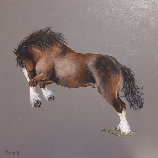 This study of a frisky shire horse is painted in acrylics on standard canvas. For sale with certification. Framed on request.