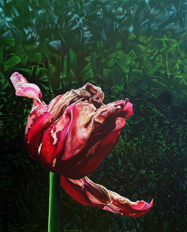 Painting of a weather beaten tulip from the garden at Rosemoor