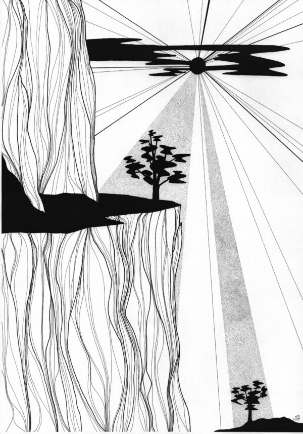 Black and white semi-surreal landscape in ink on A3 cartridge paper. Produced completely by hand using a rotring pen. The original of this piece is not for sale. However, I have had 100 copies made (web offset lithography) and the plates have been destroyed so no further copies can be produced, creating a genuine limited print run. Each print is individually signed.