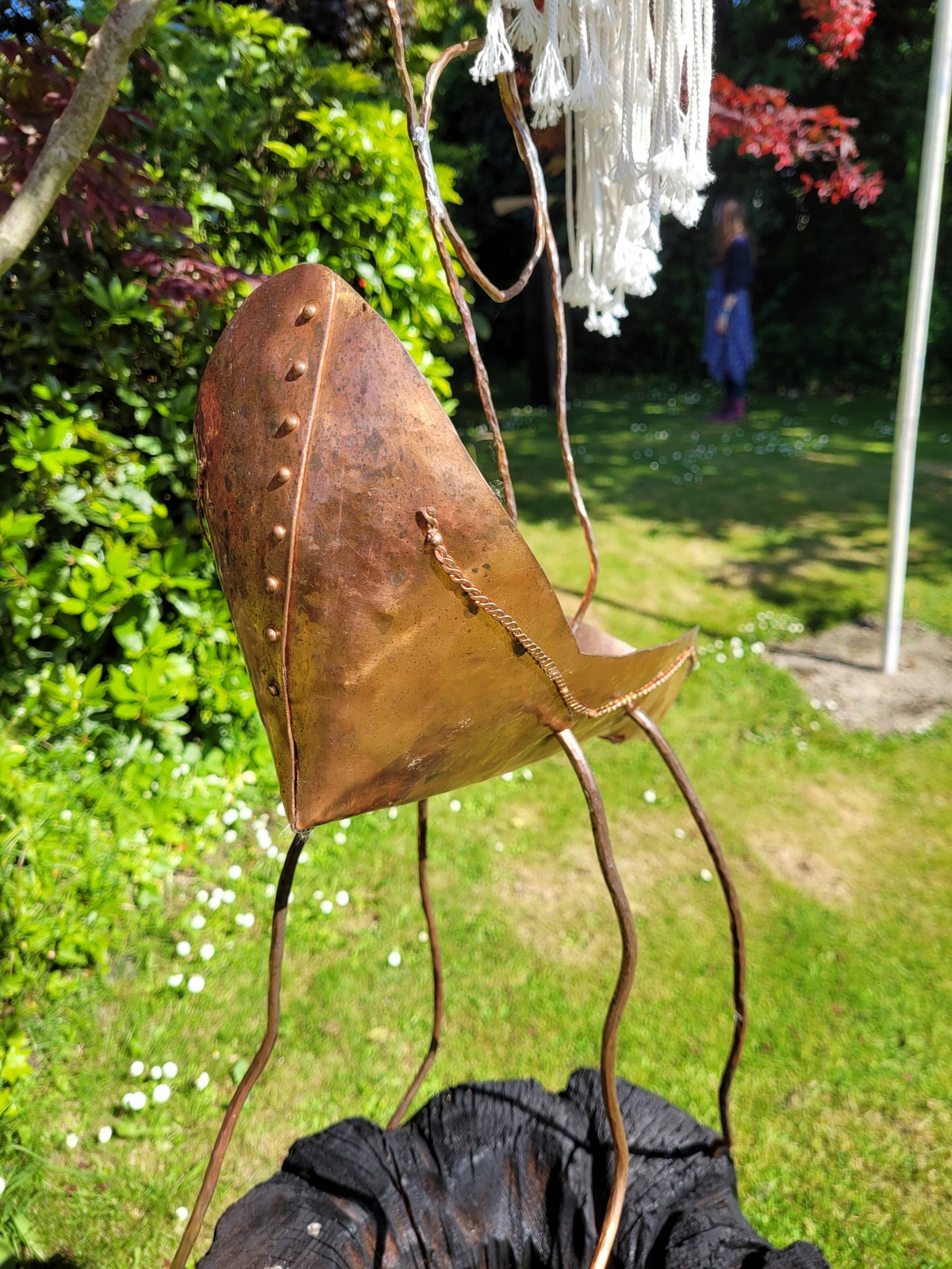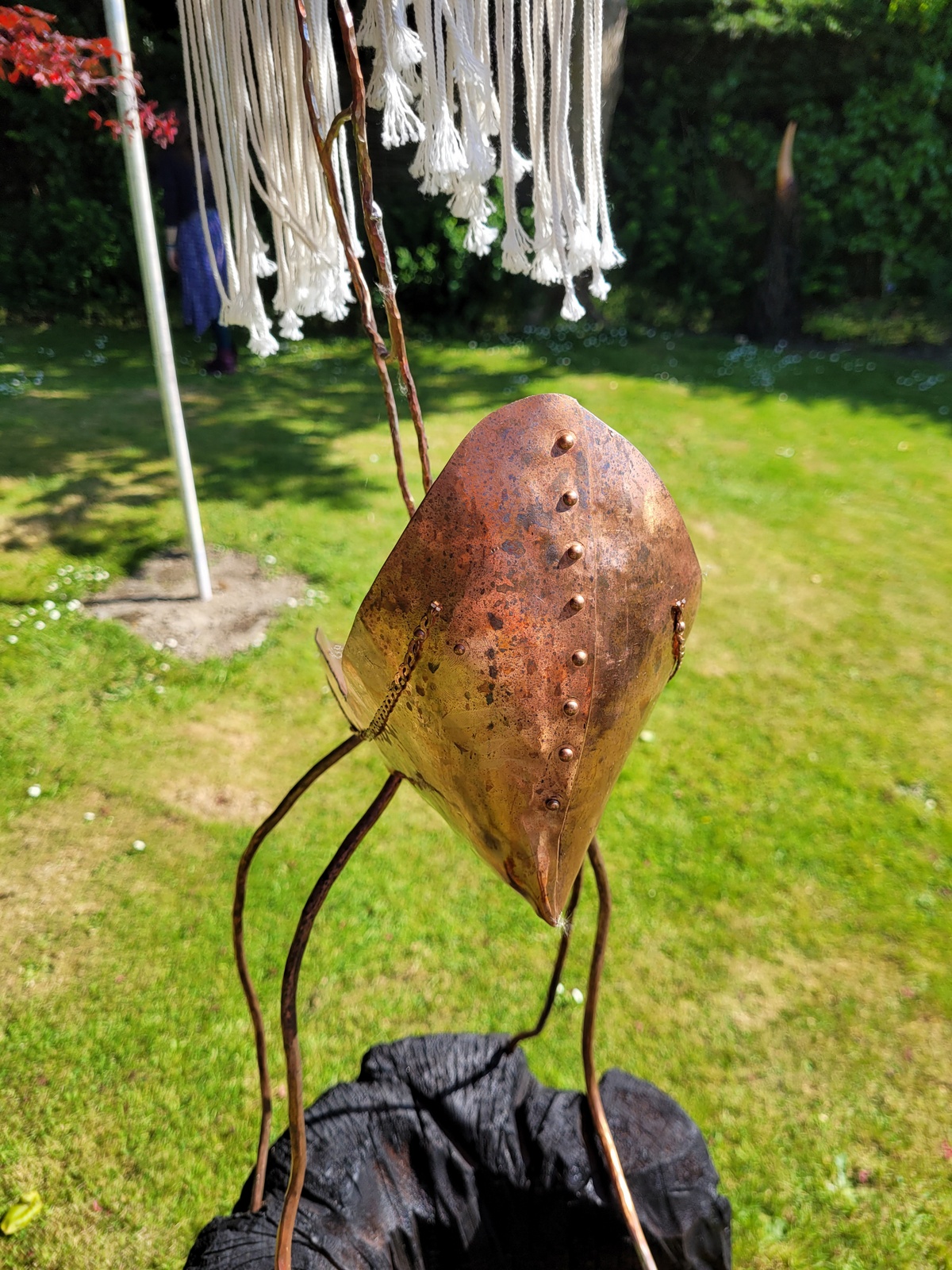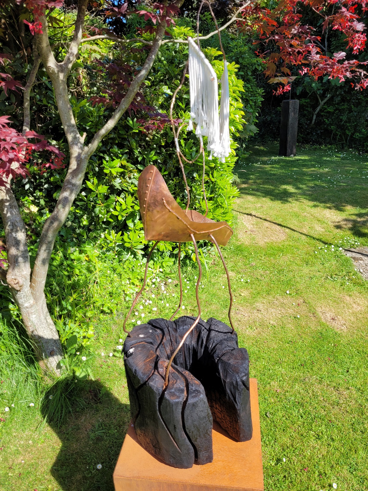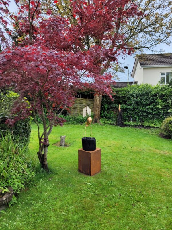 This sculpture was crafted to explore the possibilities of repurposing discarded human-made objects. The sculptures, fashioned from copper, wood and rope take on the form of an insect and is sat atop a charred piece of wood. This depiction speaks to the creature’s ability to adapt to new and challenging environments. It also serves as a poignant reminder of the current environmental challenges we face and their effect on the tiny creatures that are critical to our planet’s evolution. (Price includes plinth)