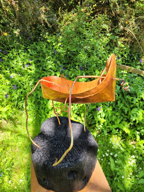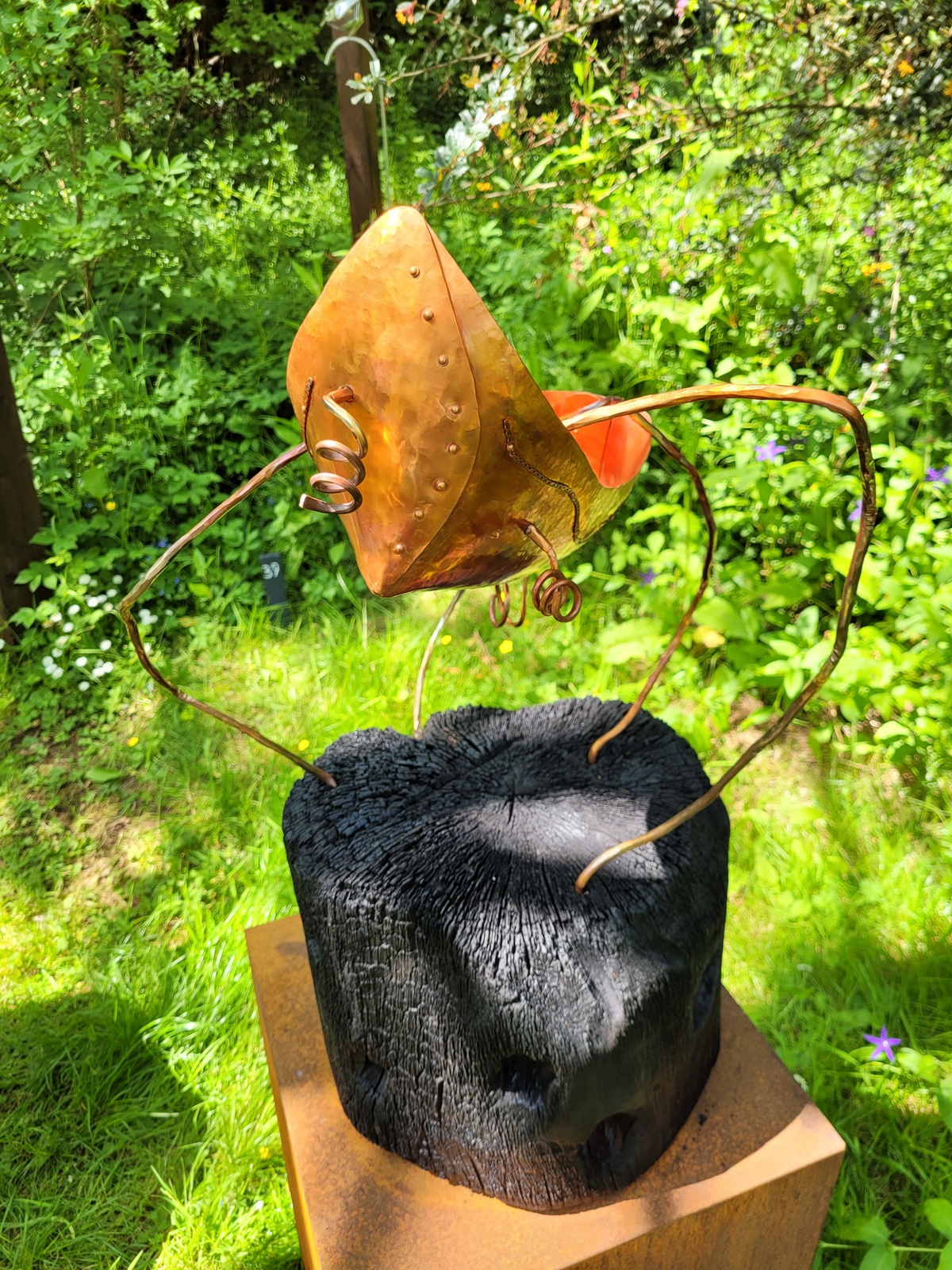 This sculpture was crafted to explore the possibilities of repurposing discarded human-made objects. The sculptures, fashioned from copper, wood and rope take on the form of an insect and is sat atop a charred piece of wood. This depiction speaks to the creature’s ability to adapt to new and challenging environments. It also serves as a poignant reminder of the current environmental challenges we face and their effect on the tiny creatures that are critical to our planet’s evolution. Price includes plinth