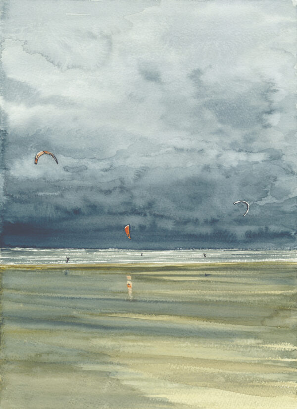 Framed original white wood square edged & mounted in white Watercolour Storm approaching Kite Surfers at low tide on Sandymere Beach Westward Ho!.