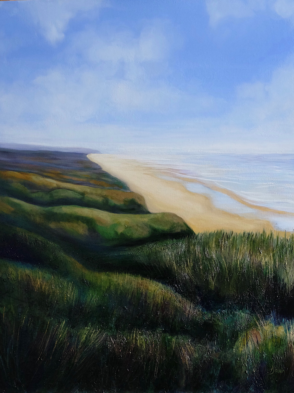 A coastal landscape using high quality oil paints on stretched cotton canvas depicting the hush of a misty morning on an empty beach that promises a beautiful summer’s day viewed from amid the dune grasses. The colours in the light that reflects from the shimmering sand and water are a lifelong preoccupation of mine. I have tried to capture the feelings of serenity and calmness that such scenes hold through thin glazes and thicker passages of impasto paint. The painting continues around the sides of the canvas and it comes with appropriate fixings ready to hang straight onto your wall. A coat of varnish has been applied to protect the painted surface. The work is signed on the front. A catalogued certificate of authenticity is attached to the back. The artwork will carefully packaged and sent fully insured via a tracked courier.