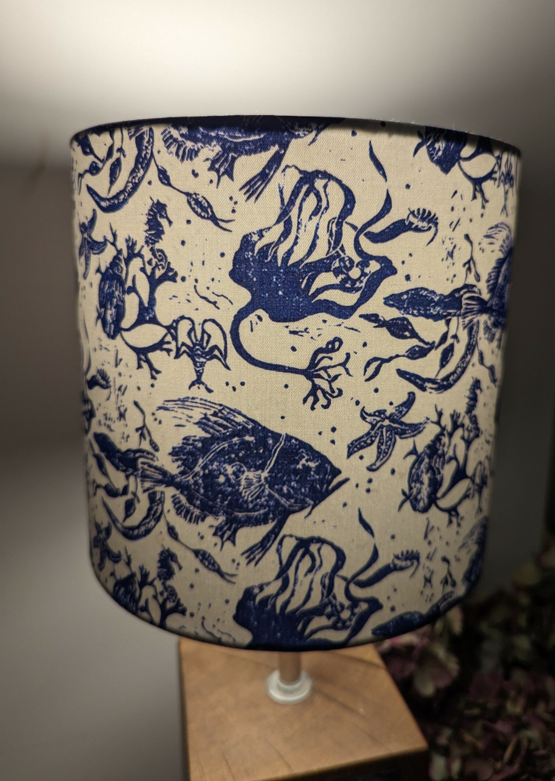 Gorgeous screen printed 30cm shade with John Dory surrounded by sea creatures. Cornflower blue on oatmeal linen.