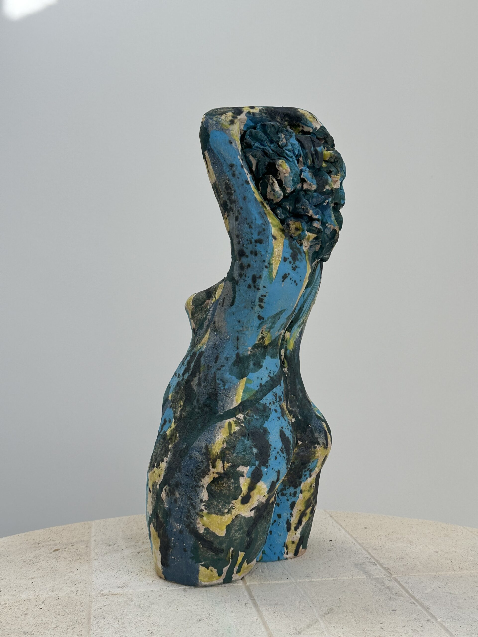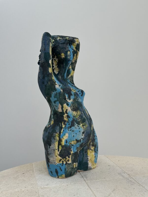 A colourful and resliant figure, but she is wondering if she has it right! She will figure it out. Stoneware with mulyiple slips and oxides, hand built with coils.