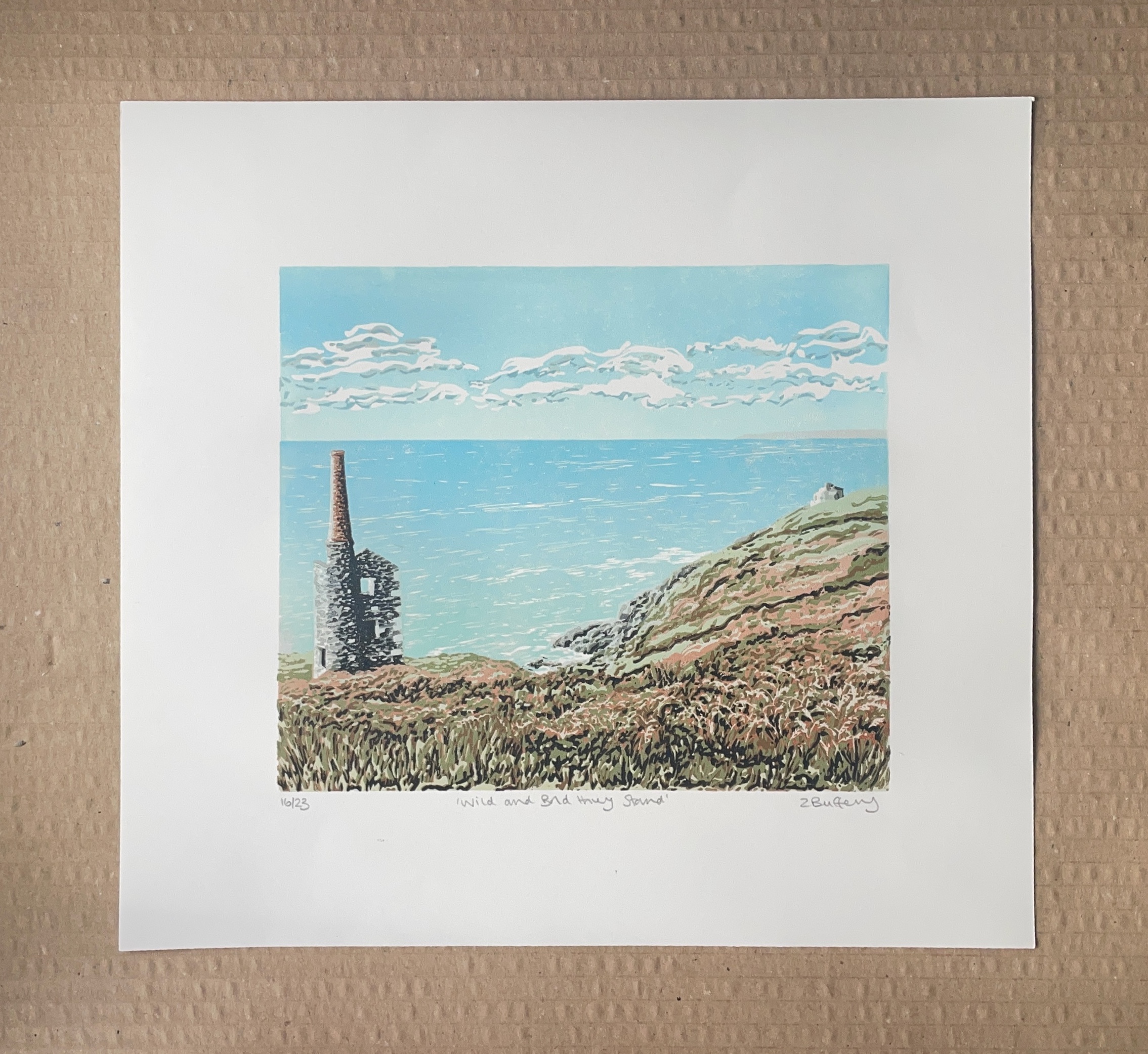 Handprinted, nine-layer reduction linocut, depicting the remains of a disused tin mine engine house, overlooking the breathtaking Cornish coast. The title of this print is taken from the "The Song of the Cornish Miners" by Herbert Thomas, 1895. "We love they cliffs, old Cornwall, As wild and bold they stand..." - Image size is approx 20.5cm x 17.5cm, plus generous border to allow for framing. - Limited edition of 23 - Each print is numbered and signed by myself on the front of the artwork. - Caligo Safewash printmakers ink, on 145gsm acid-free archival printmakers paper. - Reduction technique. - Sold unframed and unmounted