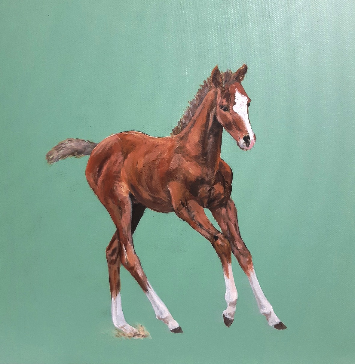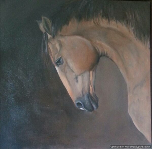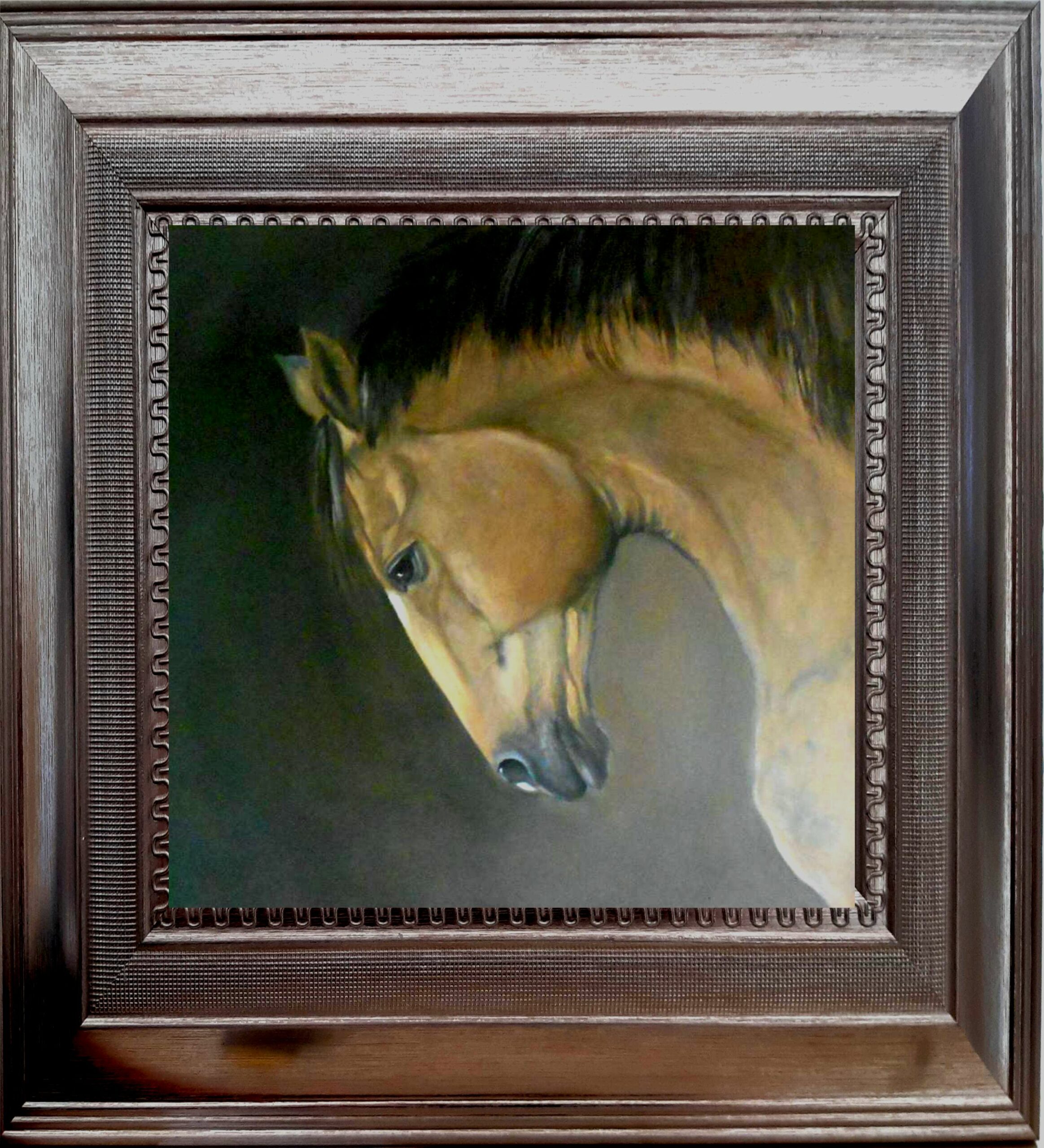 A head study of a bay stallion in oils. A neutral background for this majestic fellow. Shown here with a pewter frame as an example. For sale unframed, Certificate of Authenticity provided.