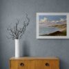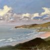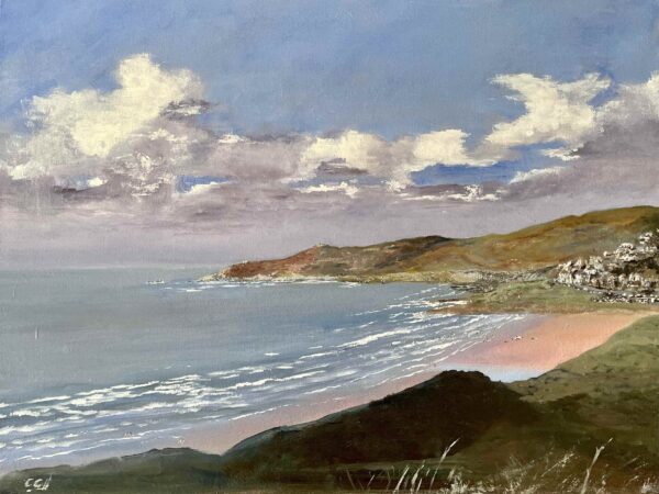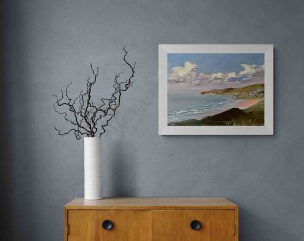 It's early season at Woolacombe Bay. A few surfers are in, the RNLI have training on the beach and the sand is looking pink in the muted glow of weak, new season sunshine. Painted from atop the dunes at Marine Drive in Woolacombe, the scene shows the beach and dunes, mostly empty, but expectant of the busy surf season to come. For now the surfers are few and the holiday makers are nil, leaving the beach to the locals and dog walkers; having the place to themselves. As with most of my original paintings, this one was painted on the spot. I wanted to try and catch the clouds and that weird light making the sands appear pink in front of me. This painting was created in oils on a 20 x 16 inch stretched canvas and is frames in white wood approx 2'' wide.