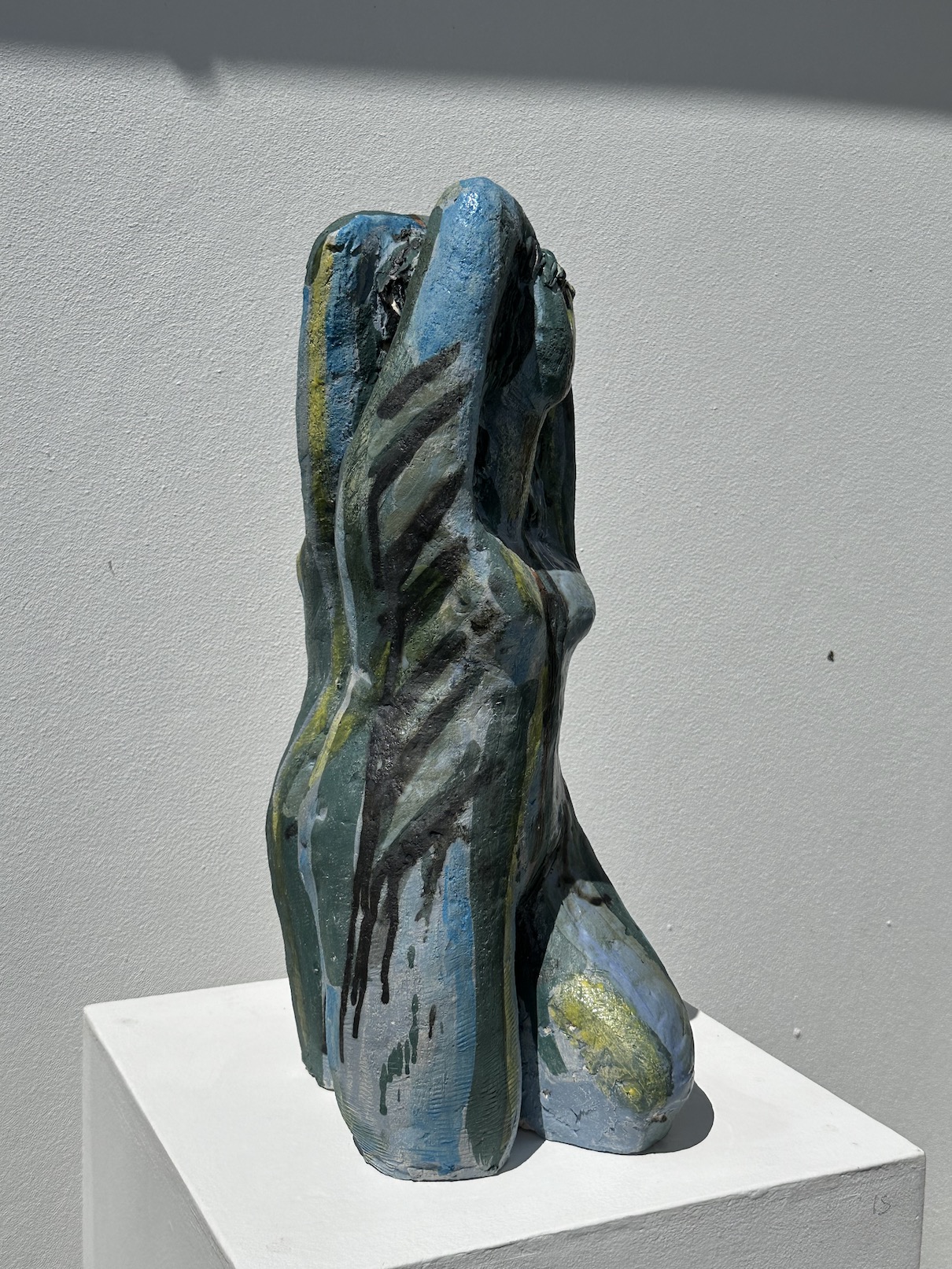 Two back to back figures, leaning on each other and holding their heads high! Togetherness gives strength and courage. Stoneware clay with slips and oxide, suitable for display inside or hout.